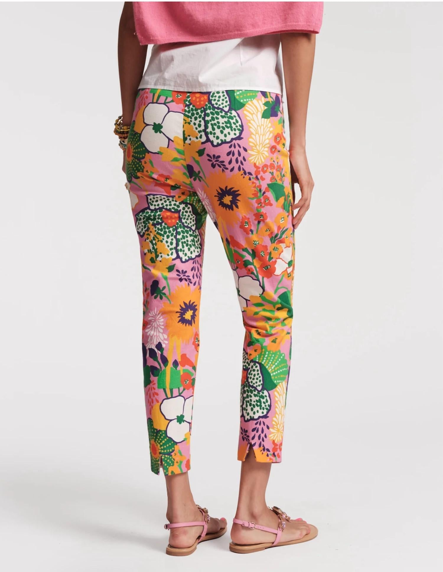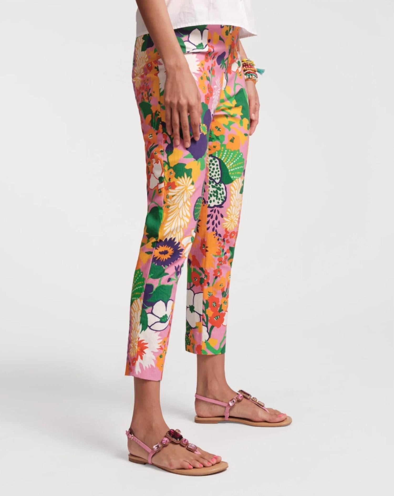 Stay on-trend and showcase your impeccable taste with these adaptable and stylish cropped pants. The perfect length to wear with your favorite mules. You'll love the fit! Introducing the Lucy Botanical Bash Pants by Frances Valentine, an effortlessly chic addition to your wardrobe in a vibrant pink multi-floral pattern. These women's cigarette pants feature a slim fit and high-rise design, with a cropped length hitting the ankle for a flattering silhouette. Crafted from 97% cotton and 3% lycra, the pants ensure comfort and style, complete with two pockets, front dart seams, and a side zipper with button closure. For care, hand wash in cold water, line dry in the shade, and avoid tumble drying or bleaching.
