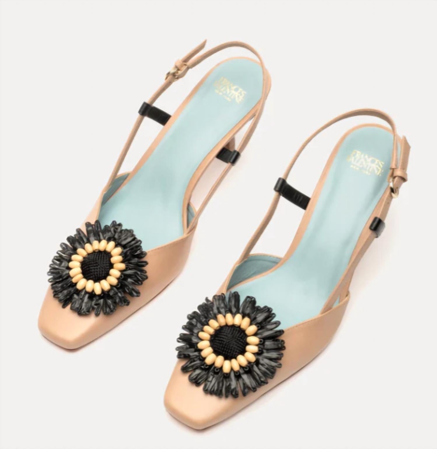 The perfect height for day to night. A chic mid-height slingback pump that’s perfect for any occasion. Crafted in Brazil from soft patent leather, this closed-toe shoe features a 2.5-inch stacked kitten heel and a charming beaded raffia flower detail at the toe. Designed with an adjustable ankle strap and cushioned insoles, it ensures comfort alongside elegance. With a squared toe shape and the distinctive FV logo on rubber soles, these heels in natural color are a must-have for fashion-forward wardrobes.
