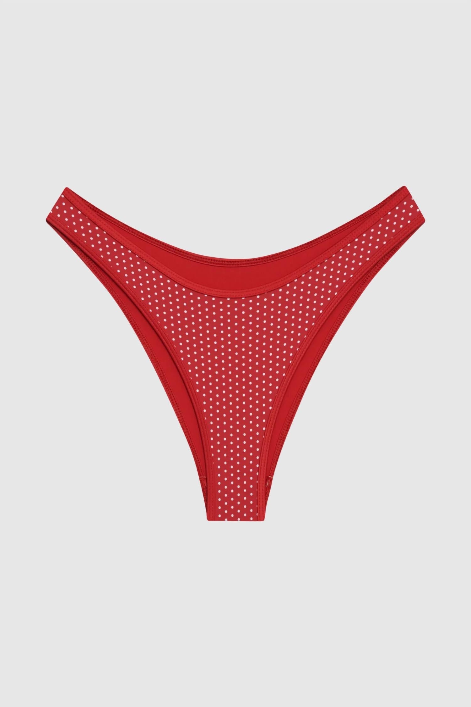 Discover the Dove Classic Bikini Bottom by Frankies Bikinis, a chic swimwear piece designed for timeless appeal. This bikini bottom features a high leg silhouette made from a soft striped rib fabric, showcasing a classic polka dot pattern in a Scarlet Dot color. Composition entails a comfortable blend of 80% Nylon, 20% Spandex, ensuring just the right stretch and fit. Style it effortlessly with the matching Nick bikini top for your most flattering set yet.