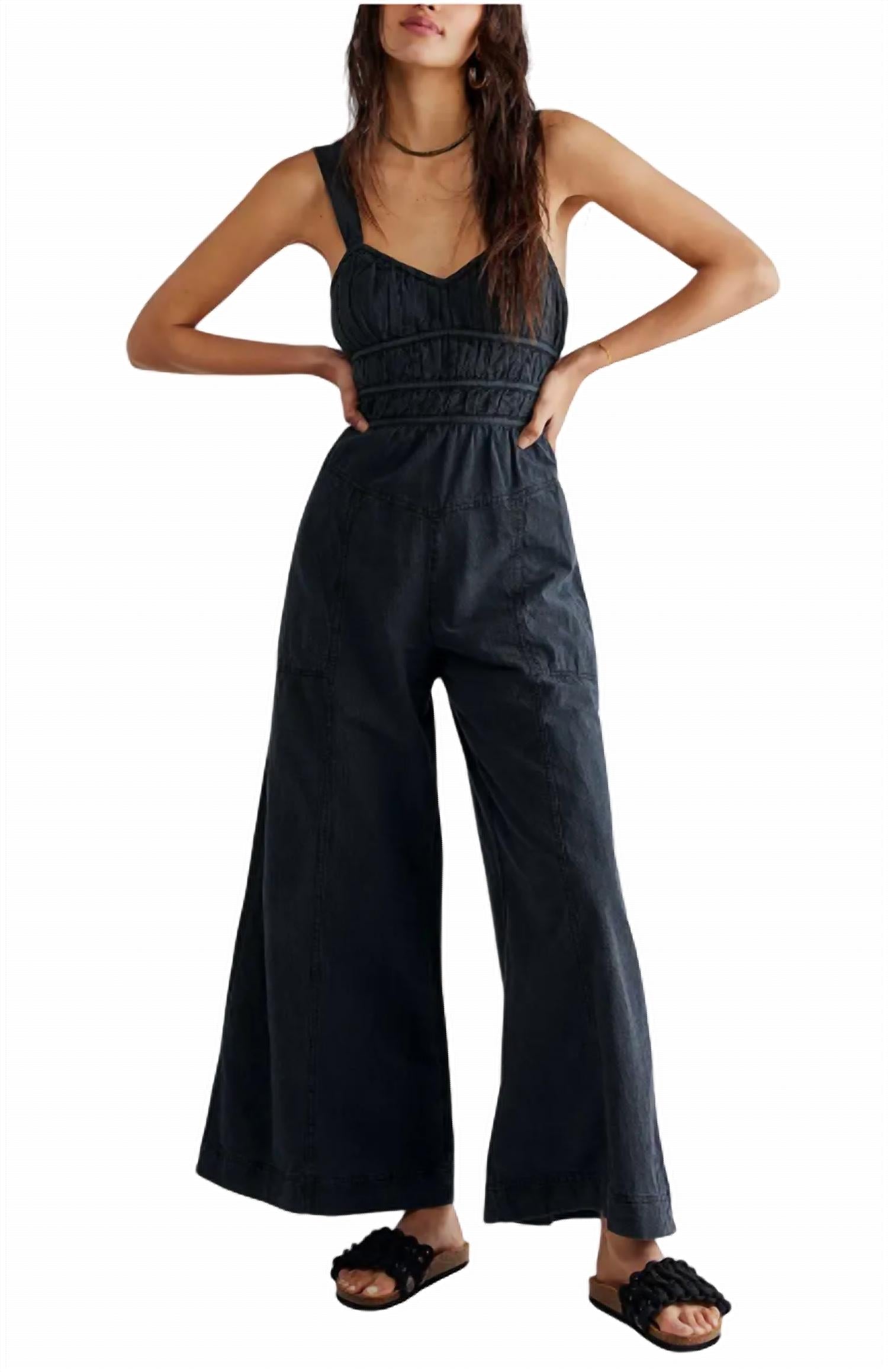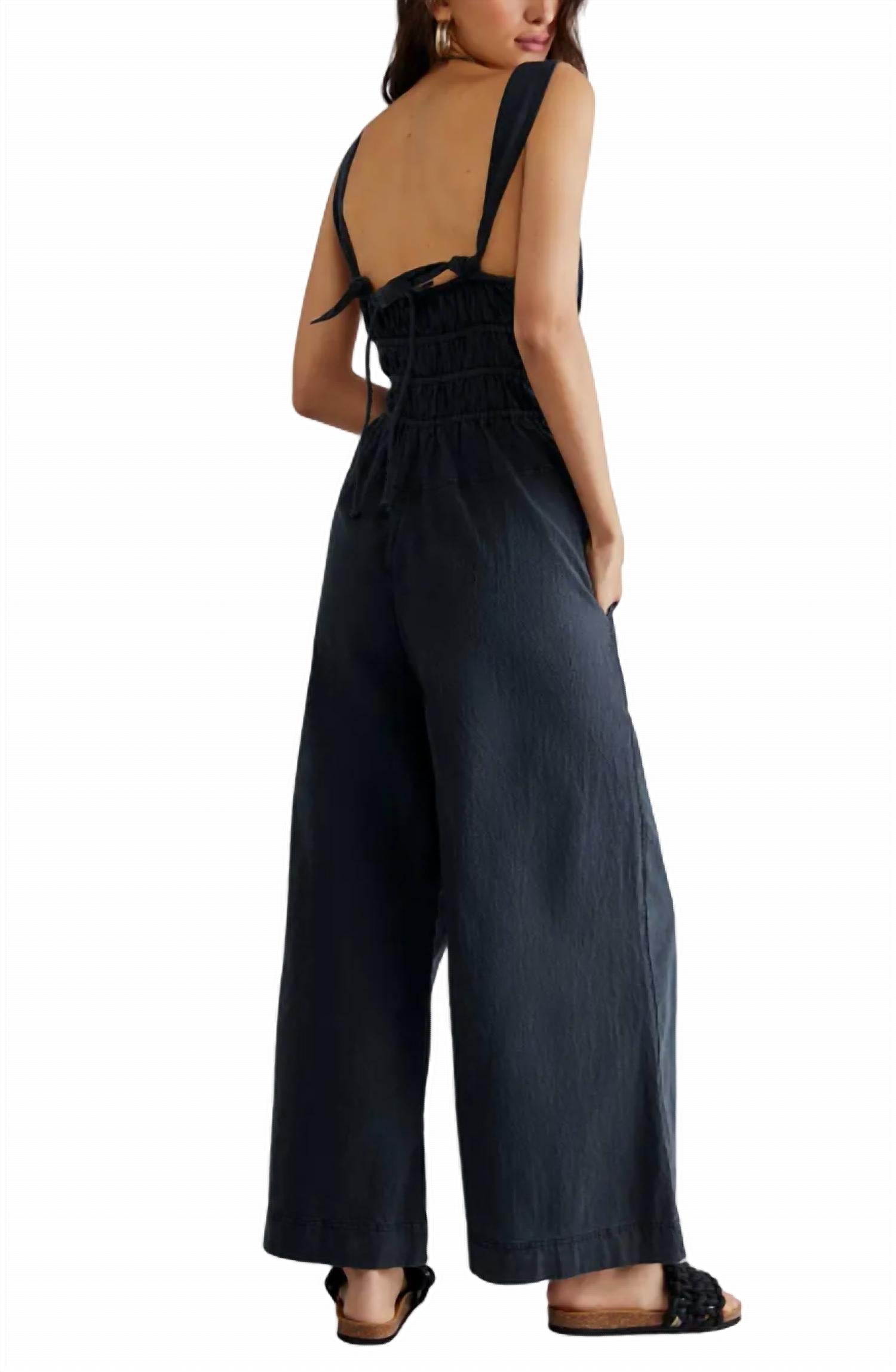 A ruched tie-back bodice tops this breezy cotton jumpsuit punctuated with wide legs. 46 1/2" center front length; 28" inseam; 32 1/2" leg opening (size Medium). V-neck. Sleeveless. Partially lined. Machine wash cold. 100% Cotton.