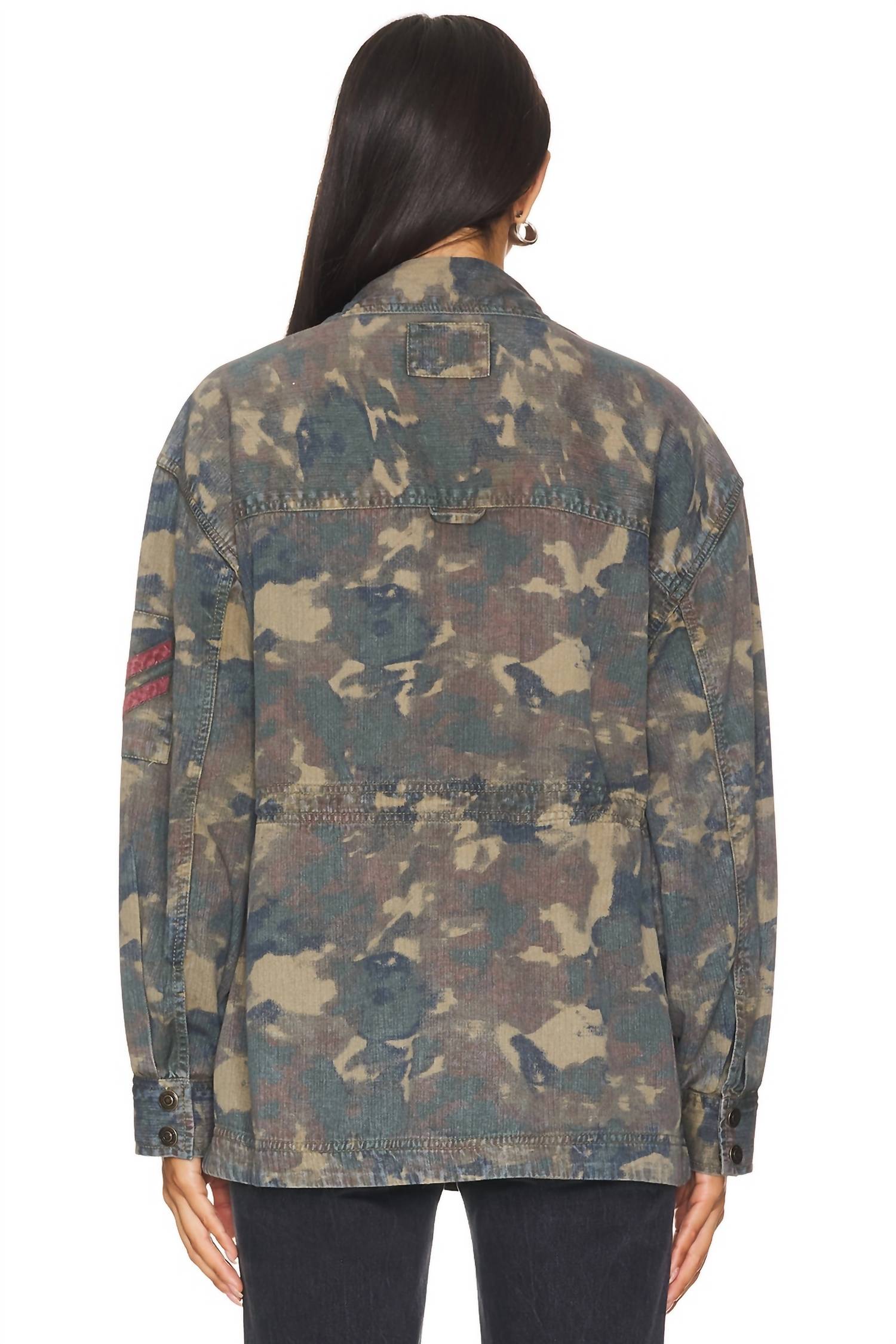 The ultimate cool-girl utility jacket. Introducing the Arya Camo Utility Jacket by Free People, a stylish choice for those who appreciate standout utility fashion. This jacket features a distinct camouflage pattern in a Dusty Olive Combo, crafted from durable corduroy material. Designed with long sleeves and a collar neckline, it offers both practicality and flair with functional pockets and a button closure. Care: Machine wash.