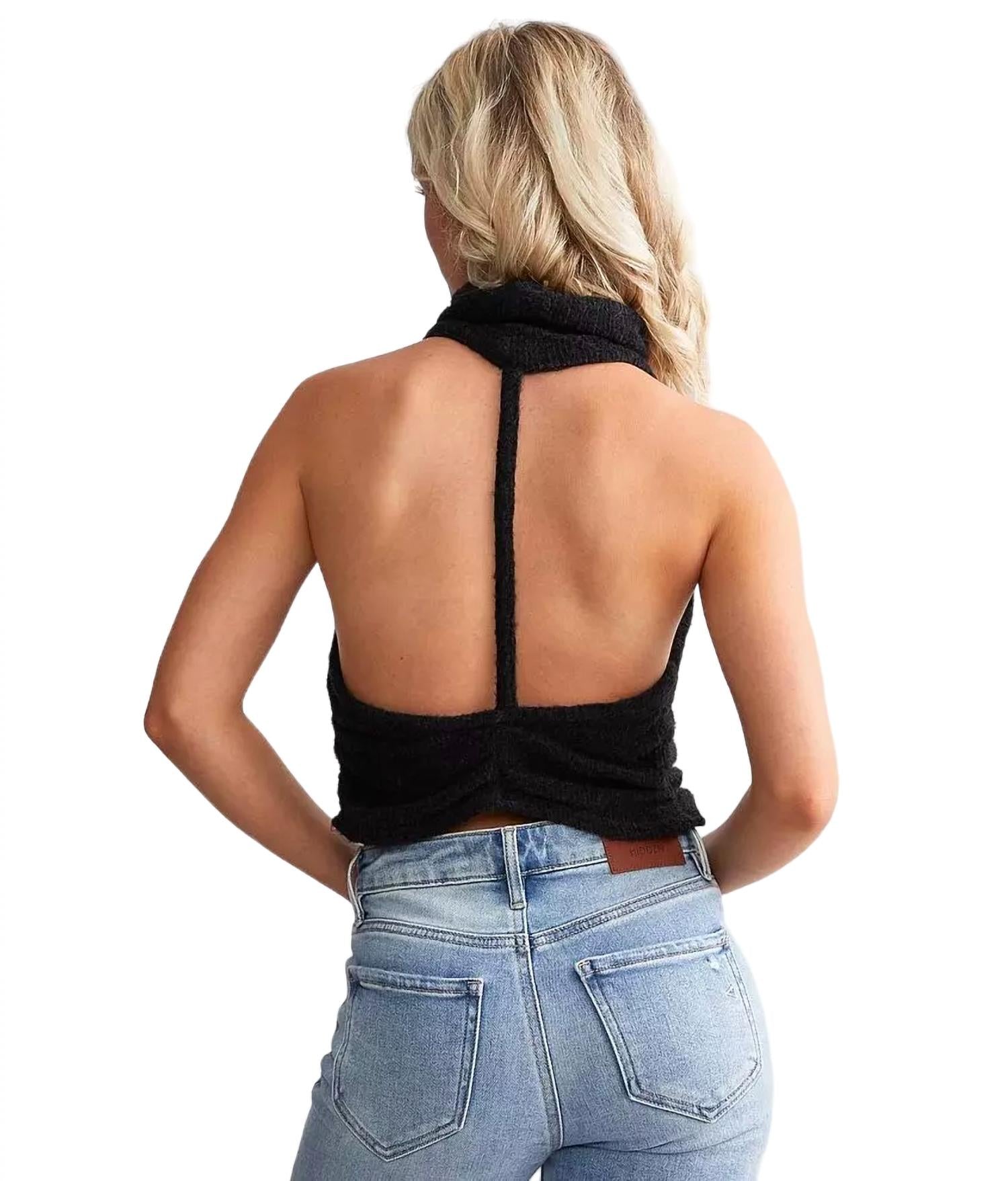Drapey, fitted silhouette. Cowl neckline. Ruching at sides. Dropped armholes. Open back design. Slightly cropped. Fabric: 30% Polyamide 70% Polyester. Hand Wash Cold. Measurements for size Small - Bust: 28 in. Length: 18.5 in.