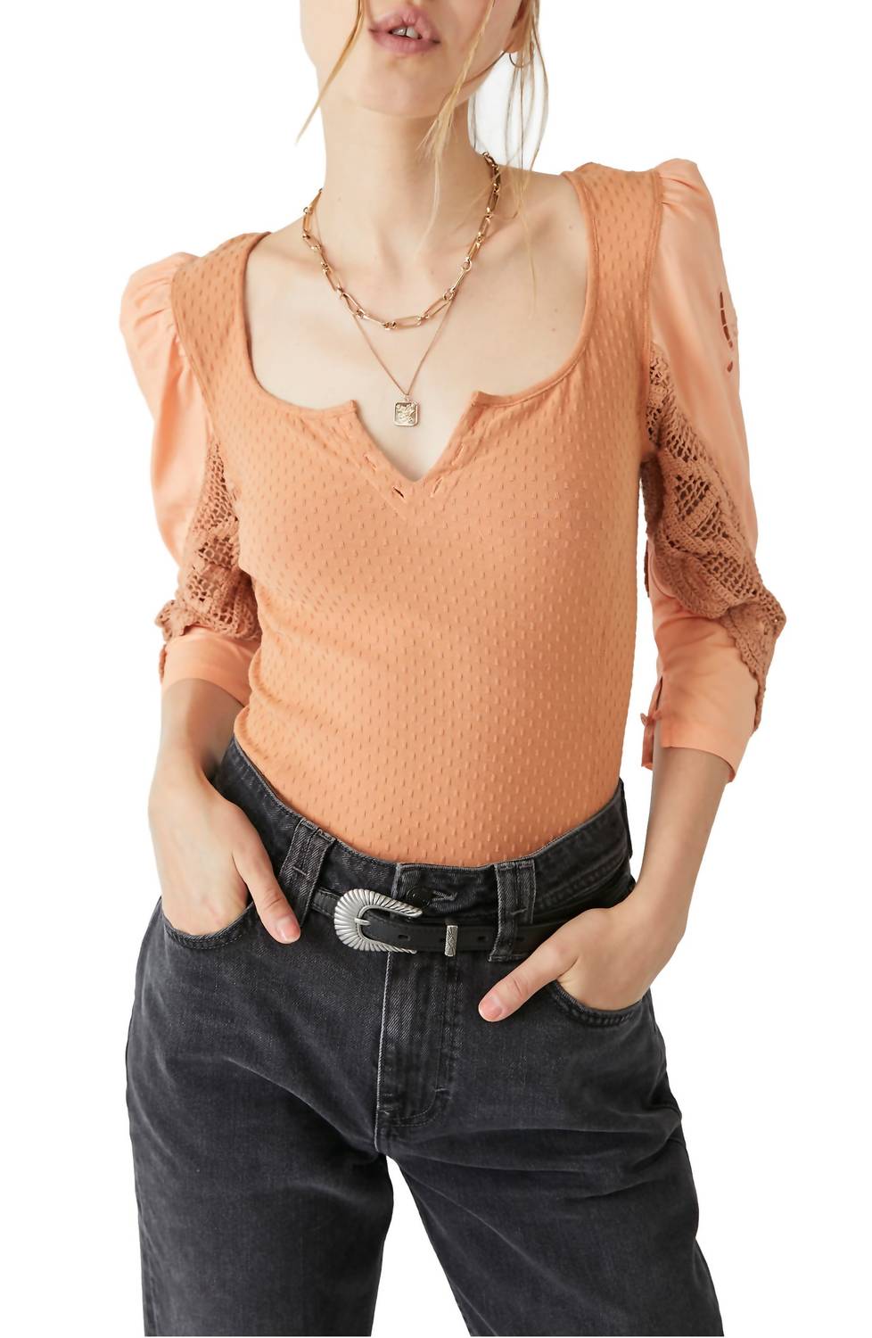 A timeless blouse that will never go out of style.A split neckline and puffed-up sleeves bring romantic flair to a stretch-cotton top detailed with embroidery. 20 1/2" to 23" length (size Medium). Split neck. Three-quarter sleeves. 95% cotton, 5% spandex. Machine wash, tumble dry. Imported. True to size. XS=0-2, S=4-6, M=8-10, L=12-14, XL=16