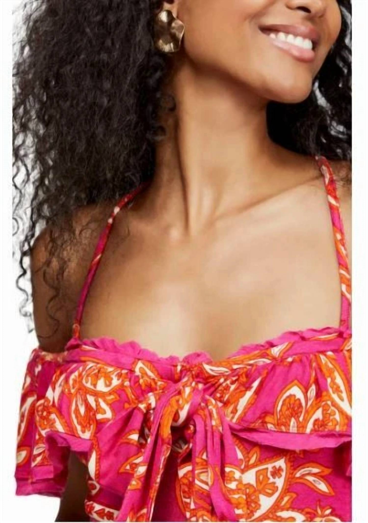 This classic tank top is perfect for layering and cute enough to wear on its own. Introducing the Cha Cha Cold Shoulder Flounce Top by Free People, a vibrant addition to your wardrobe. This women's blouse boasts a detailed paisley print and features short cold-shoulder sleeves, designed with an off-the-shoulder flouncy popover neckline that ties into a charming bow. Made from a comfortable blend of 95% rayon and 5% spandex, this top measures 10" at the center front length. Easy to care for with machine wash and dry flat instructions, it's true to size for effortless styling.