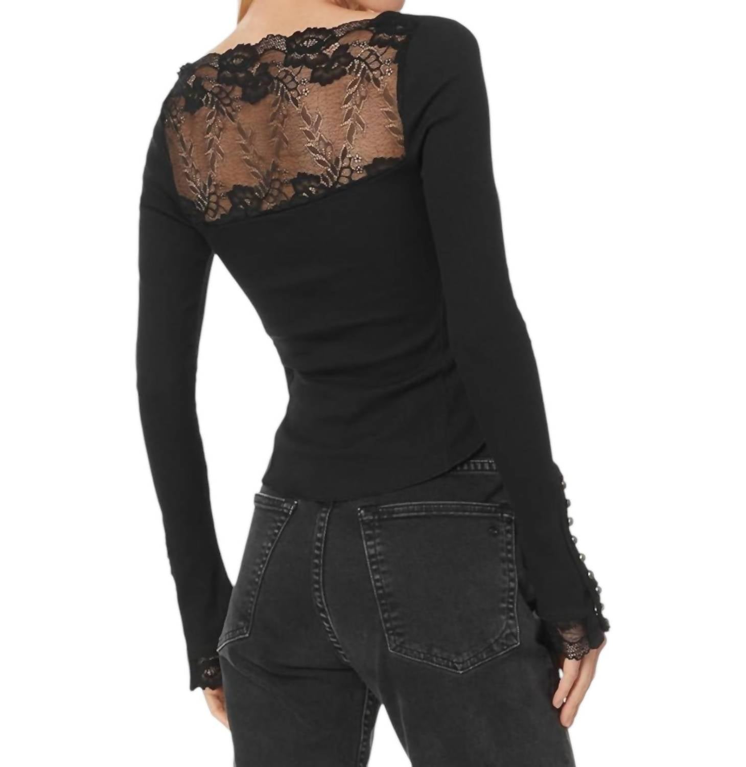 Blend of simple elegance and stylish detail. Crafted from a soft cotton composition with 97% Cotton and 3% Elastane. Boasting a slim-fitting silhouette that sits at hip length. Square neckline paired with feminine lace detailing, snap-button cuffs, and defined seam details. Dimensionally precise with a bust of 29.5 inches and a length of 22.12 inches. Designed for ease with a pull-on closure. Machine wash cold friendly.