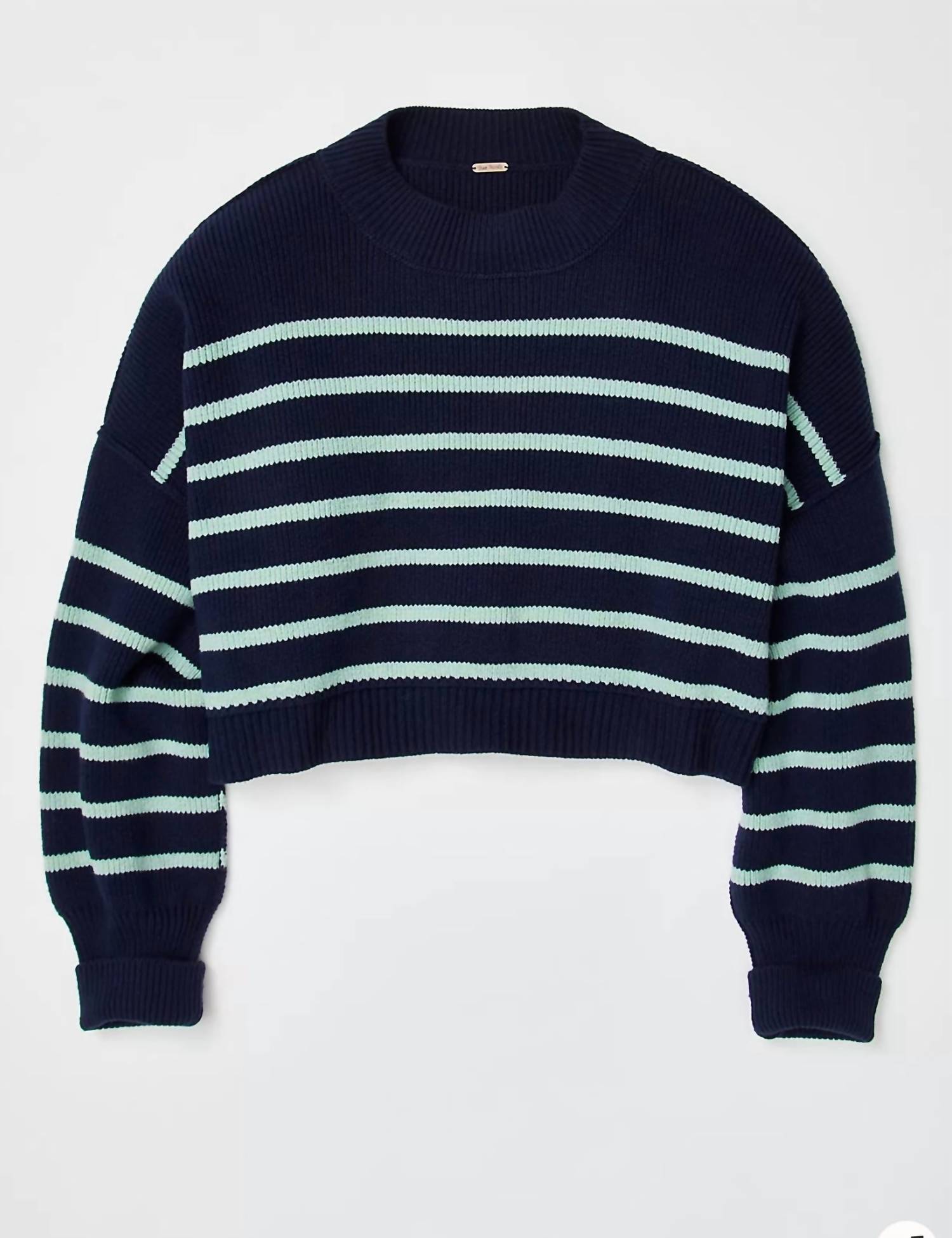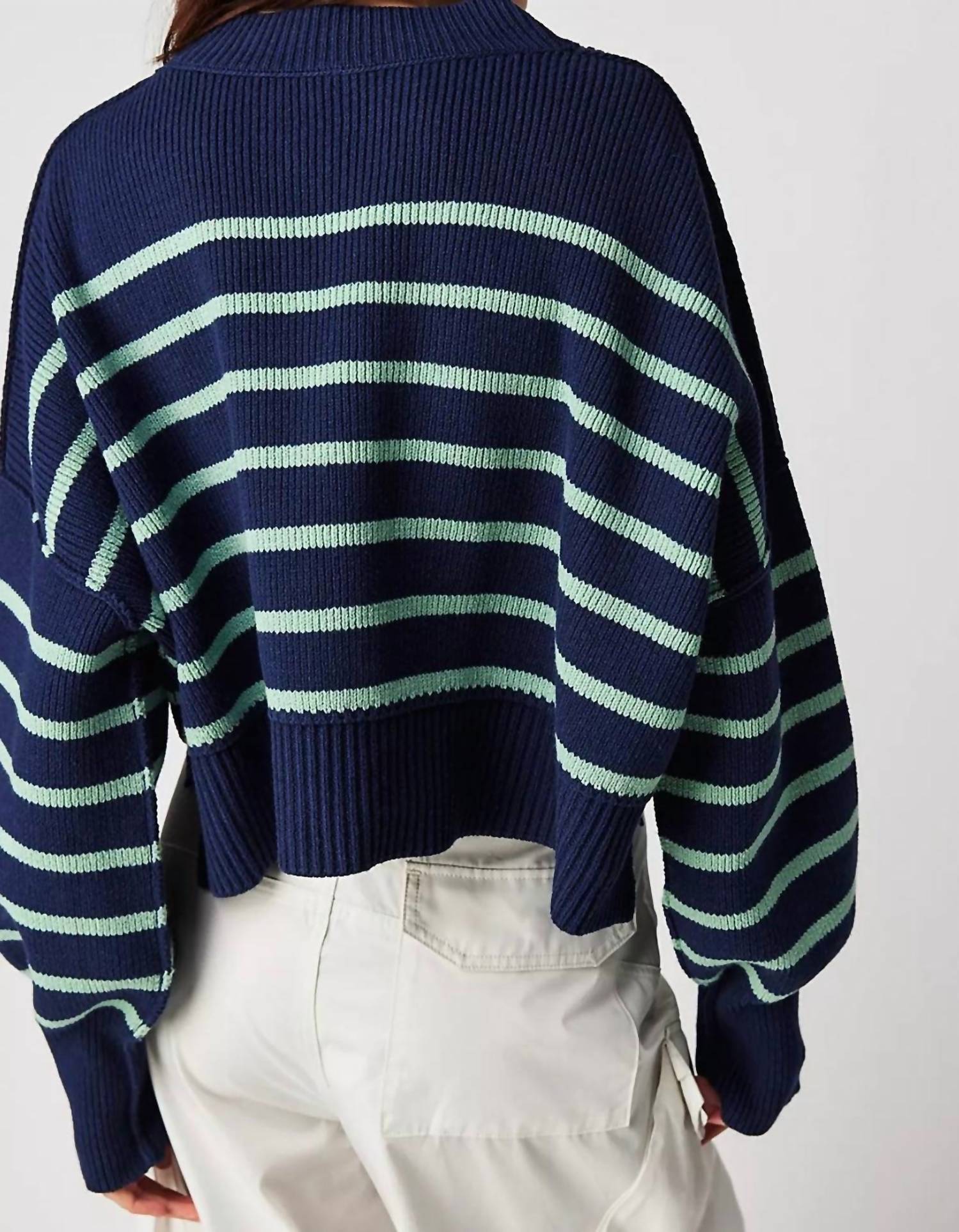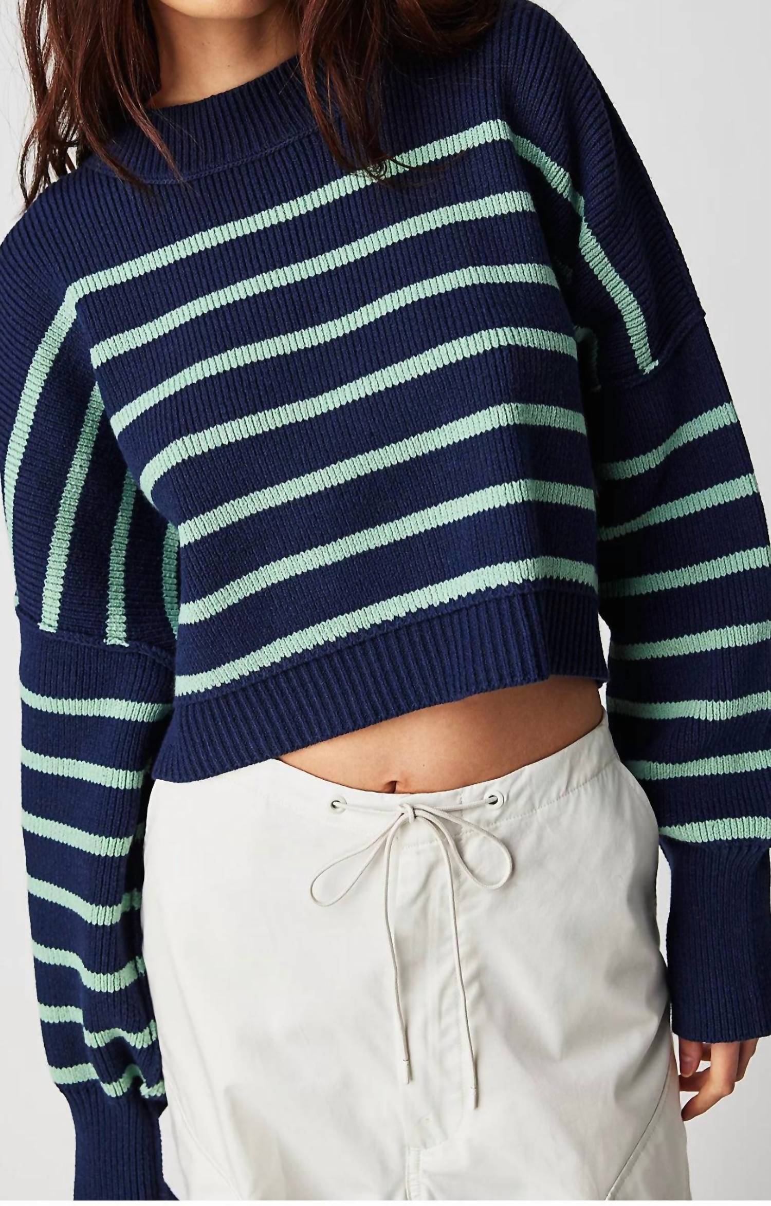 Experience the perfect blend of comfort and style with this trendy crew neck sweater, designed to effortlessly elevate your wardrobe. Pair it with your favorite denim and loafers for the perfect look.Indulge in the classic charm of the Easy Street Stripe Crop Pullover, brought to you by Free People. This versatile navy combo sweater is an absolute wardrobe essential, designed in a forever chic striped pattern that never goes out of style. The slouchy, cropped fit offers a relaxed yet contemporary look, while the ribbed knit fabrication adds a textural depth that complements any outfit. It features a mock neckline for an extra touch of refinement, and the defined seaming coupled with slightly exaggerated sleeves grants this sweater a unique silhouette. Perfect for pairing with your favorite staple denim, tailored trousers, or a sweet skirt, it's the ideal throw-on-and-go piece to seamlessly integrate into your classics collection. Whether you're lounging at home or stepping out for a casual outing, this pullover ensures you stay effortlessly stylish. Length: 17". 1% Elastane, 37% Acrylic, 56% Cotton, 6% Polyamide.