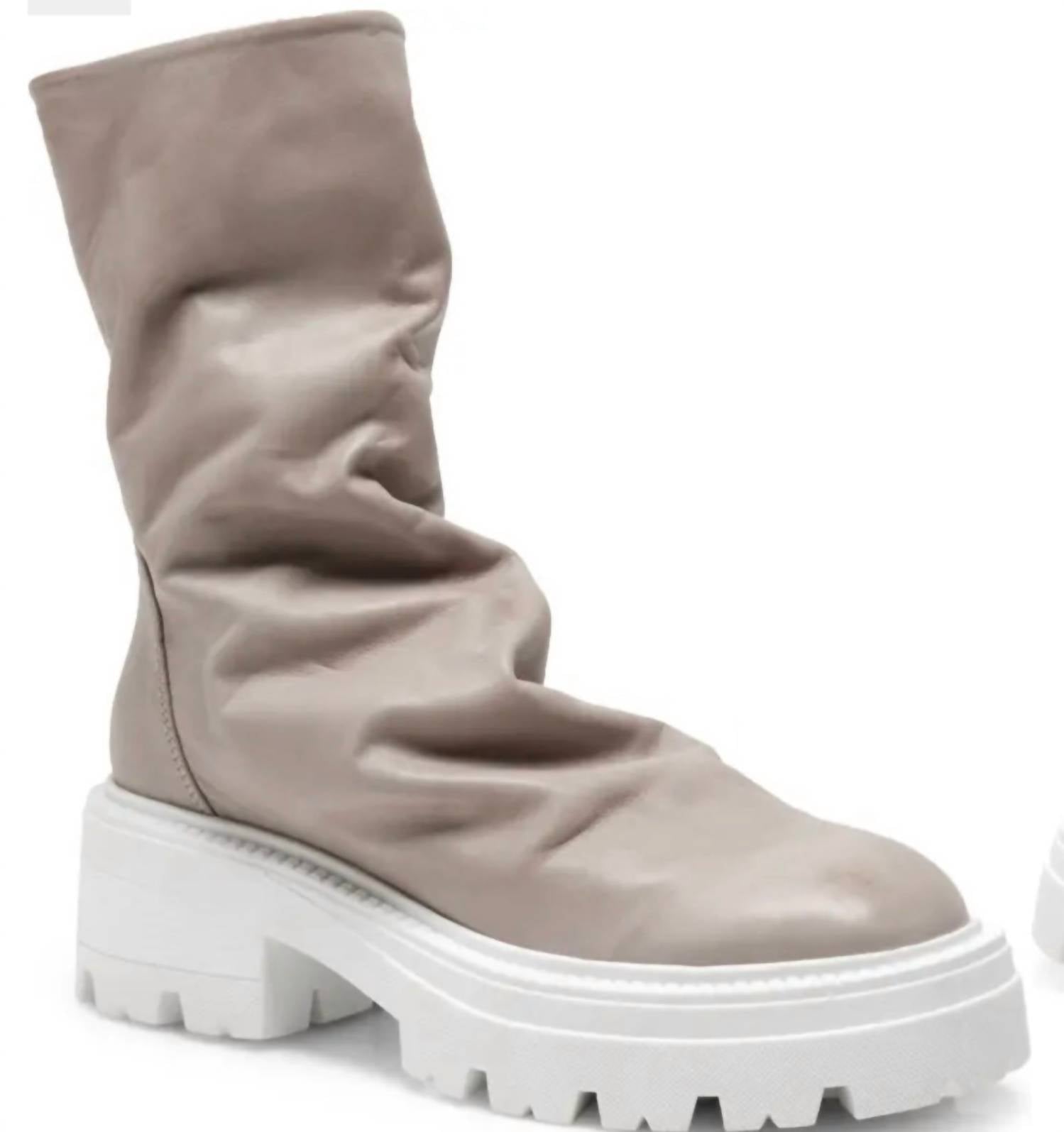 Buttery soft leather, these fitted ankle boots. Unique ruched detailing. With a mid-calf length and a sturdy chunky heel. The round toe and rubber tread platform. Featuring a back zipper closure for easy wear and a lightly padded leather insole. Heel height is an elegant yet practical 2", complemented by a 1.25" platform and an 8.5" shaft height, while the 12" boot circumference provides a snug fit.
