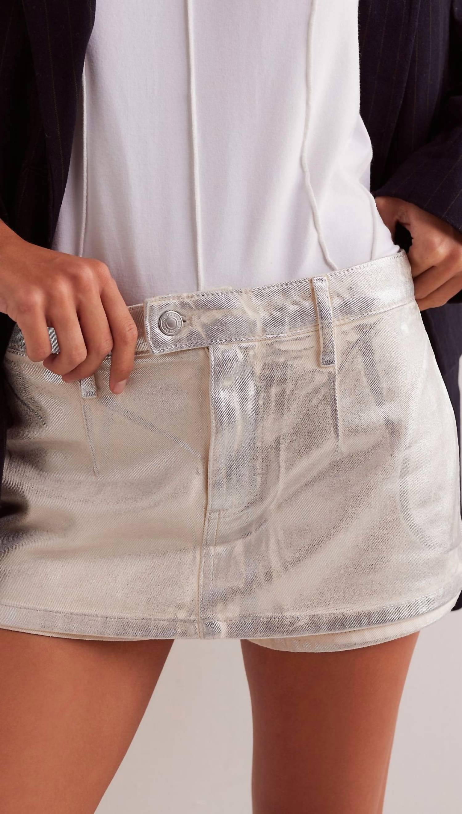 Make a dazzling impression with the Galivanting Metallic Skort by Free People, designed in a bold silver hue. Crafted from 100% Cotton, this skort offers the playful appeal of a skirt with the practicality of shorts, complete with convenient pockets. Closure: Button closure. Care: Machine wash cold with like colors, use only non-chlorine bleach, tumble dry low, and low iron as needed. Model is wearing a size small (5'7" height, 34" bust, 25" waist, 35" hip).
