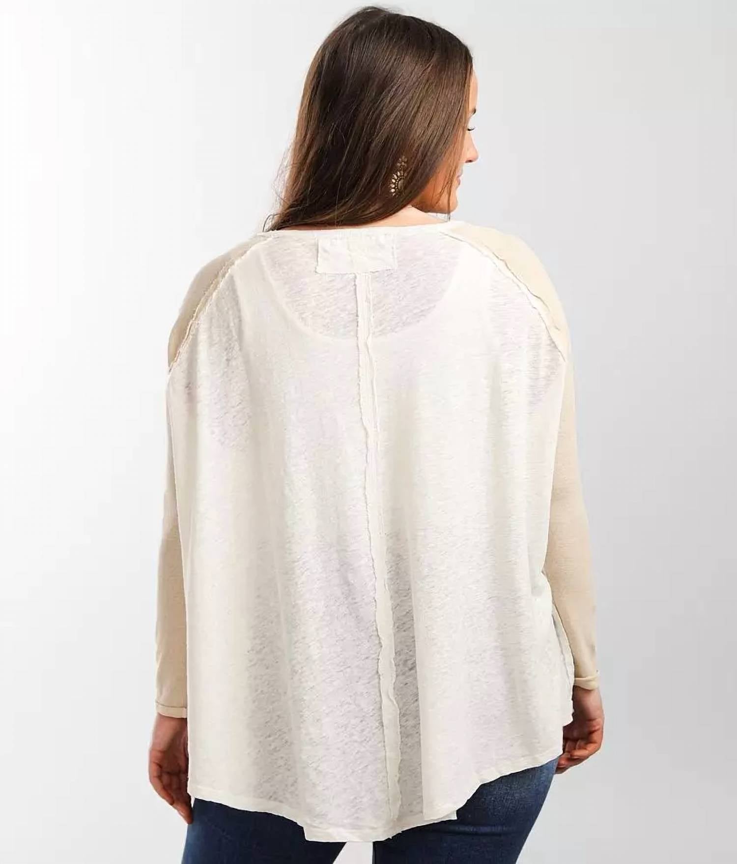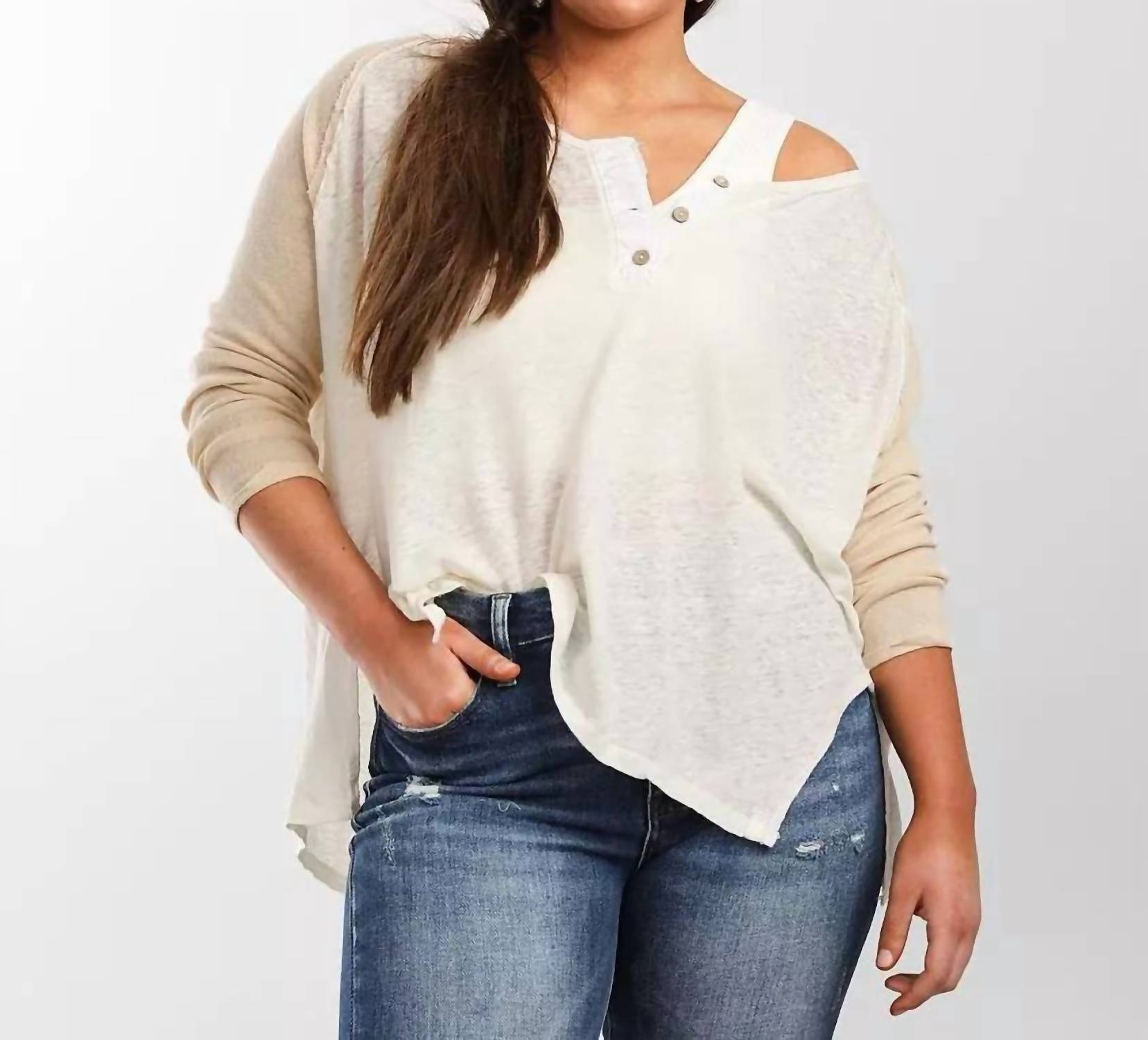 Raw edge slub knit linen blend henley. High low hem. Raglan sleeves. Fabric: 52% EU Flax Linen, 48% Cotton. Hand wash cold. Measurements on size Small - Bust: 51", Body length: 22".