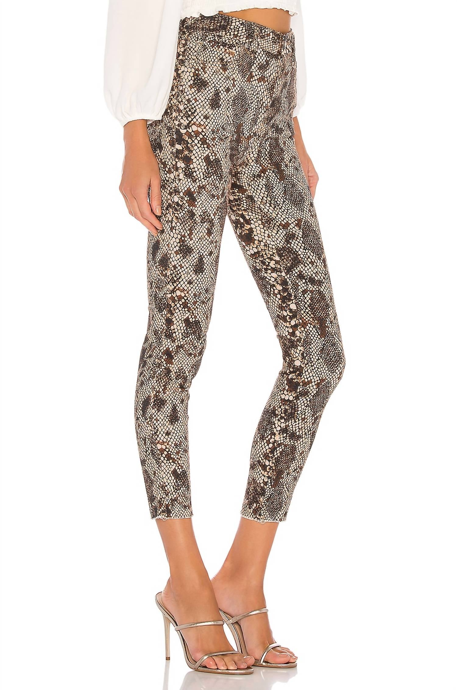 Introducing the High Rise Jegging by Free People in an eye-catching Two Faced Snake pattern. These jeggings feature a high rise with a rise measurement of 10" and a skinny leg style, providing a flattering fit. The composition is an innovative blend of 53% Cotton, 23% Rayon, 22% Polyester, and 2% Spandex, ensuring comfort and flexibility. Designed with a 26" inseam, a 12" knee opening, and a 9" leg opening, these jeggings include a 5-pocket design and a raw hem. Made in Turkey, they feature a zip fly with a button closure for ease of wear.