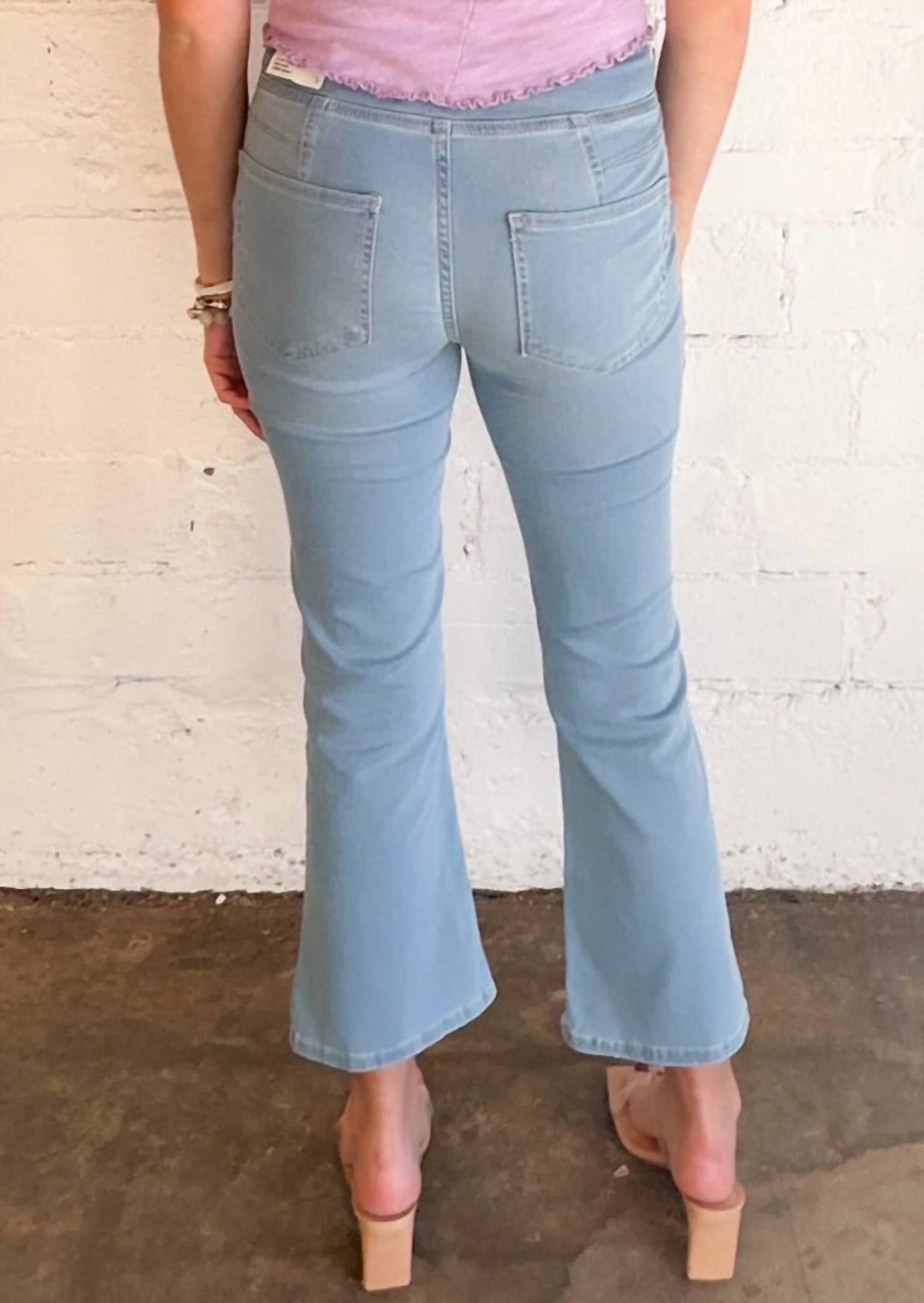 Mid-rise, classic slim flare silhouette. Flat front and back, elastic waistband for pull-on ease, cropped inseam. Machine Wash Cold. Imported. 11% Viscose, 21% Polyester, 2% Viscose, 66% Cotton. Height: 5’7”, Bust: 34”, Waist: 26”, Hips: 36”. Wearing size: Small.