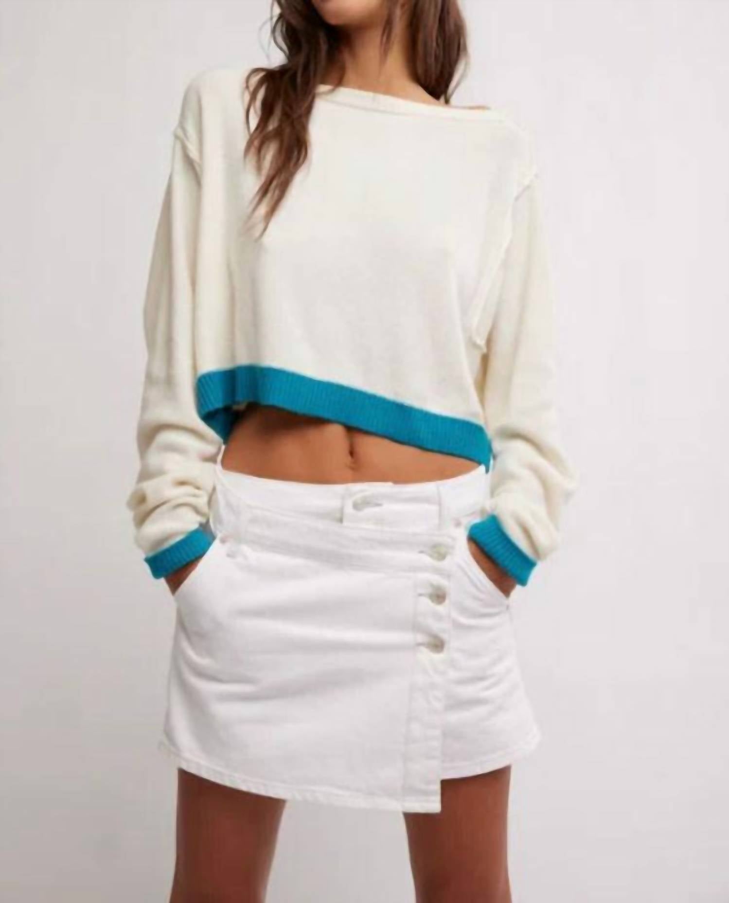 Meet the Free People We The Free Into The Blue Pullover Sweater, a perfect blend of style and comfort for your fall wardrobe. This long-sleeve, off-the-shoulder sweater features a playful white and blue textured pattern, ideal for adding a touch of preppy flair to your travel outfits. Crafted from 43% Polyamide, 29% Cotton, and 28% Wool, its cropped silhouette makes it versatile for layering. Closure: Pull on. Care: Hand wash and line dry.