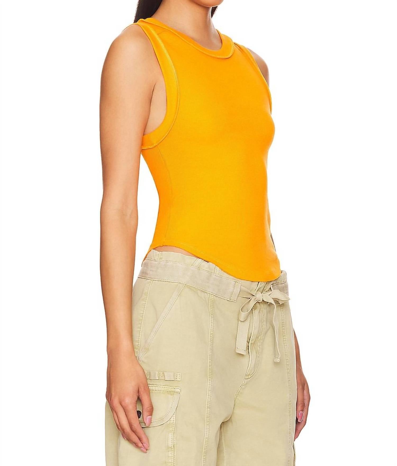 This sleeveless tank-inspired top offers an effortless, versatile design with a rounded bottom hem and exposed seaming for a lived-in look, made from a structured yet stretchy 95% cotton and 5% spandex blend, with a body-hugging fit. The model is 5' 9'' and is wearing a size XS.