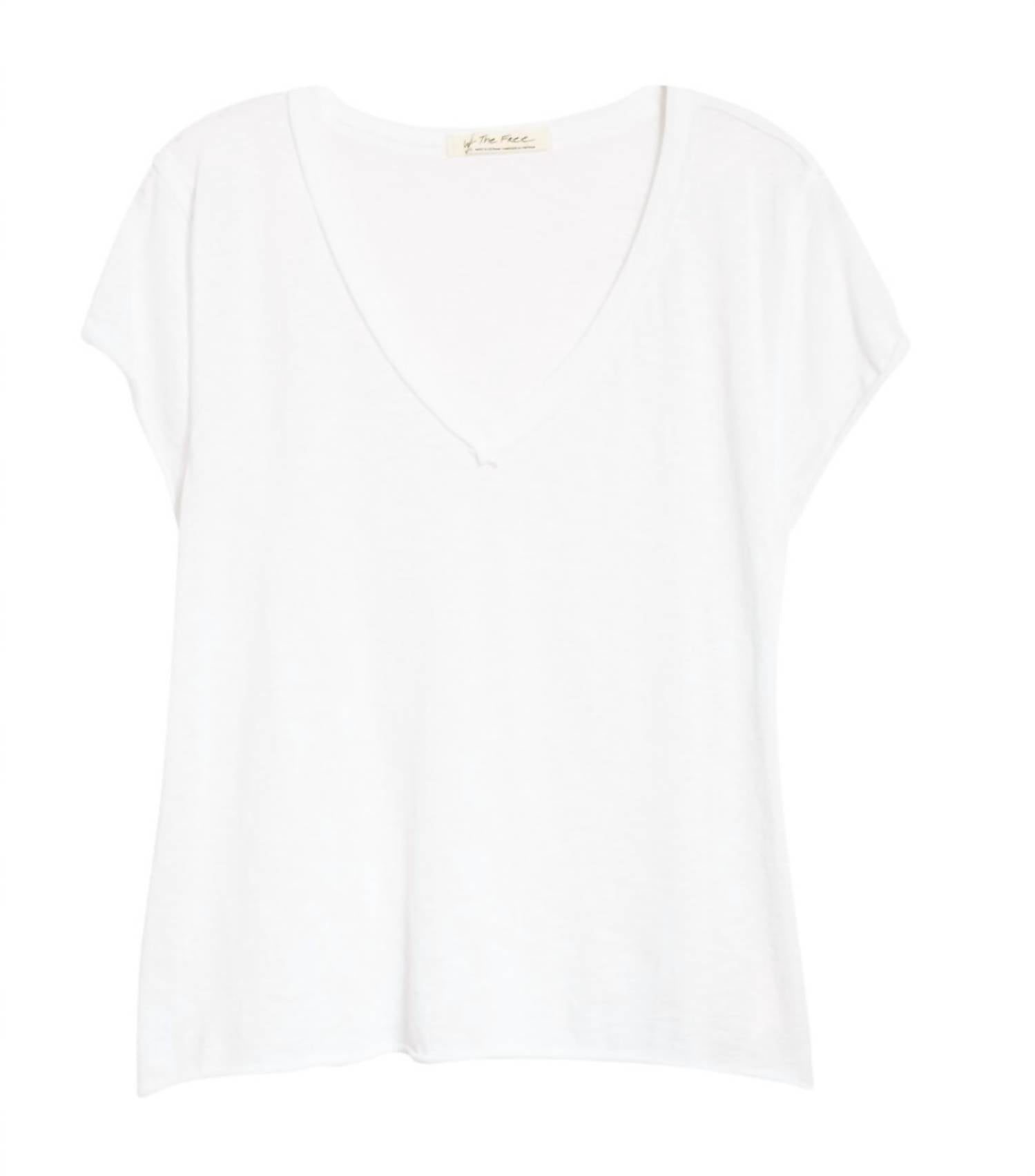 Exposed seams and tacked-up sleeves. Lightweight top cut from a soft, smooth, semi-sheer cotton blend. V-neck. Short sleeves. Fabric: 60% Cotton, 40% Polyester. Dry clean or machine wash. Model is 5'11" and is wearing a size XS. 24 1/2" length.