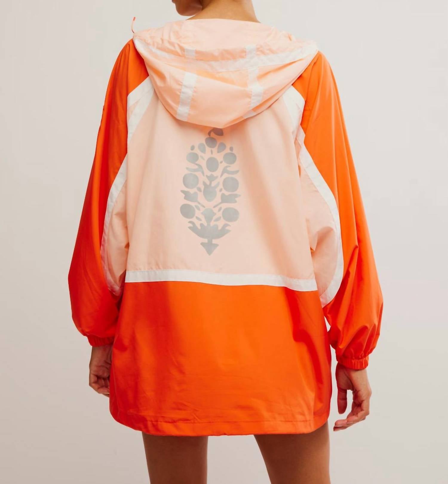 Introducing the Like The Wind Colorblock Jacket by Free People, a stylish utility piece in a peach combo perfect for spring athleisure. This long sleeve jacket is crafted from water-resistant polyester, featuring a relaxed, slightly oversized fit with a drawstring adjustable hood. It includes a half-length zip closure for ease of wear and an adjustable bottom hem with elasticated cuffs for a secure fit. Care instructions are simple with a machine wash cold and tumble dry.