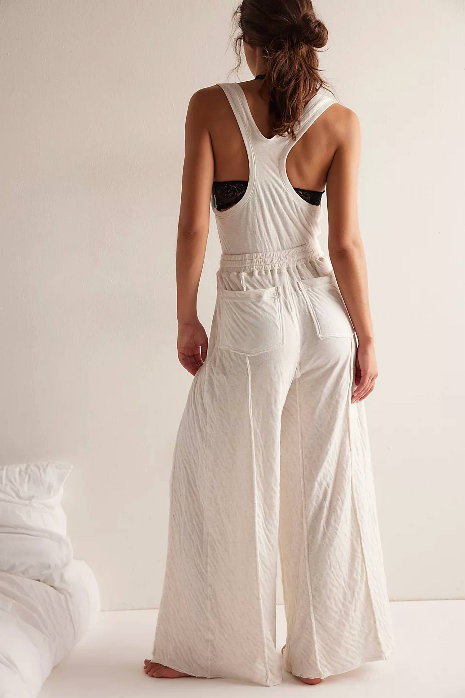 Throw it on and go! Introducing the Wait A Minute Jumpsuit by Free People, a chic one-piece in Oatmeal Combo designed for ultimate comfort and style. This sleeveless jumpsuit features a racerback top and wide legs, crafted from lightweight cotton for a relaxed fit. It has a practical tie closure and an elastic waistband with a drawstring, complemented by back pockets and seamed details. Care for your jumpsuit by hand washing and laying flat to dry, and enjoy its 29.5-inch inseam for a versatile fit. Model is wearing a size small (5'8" height, 33.5" chest, 28.5" waist, 40" hip).