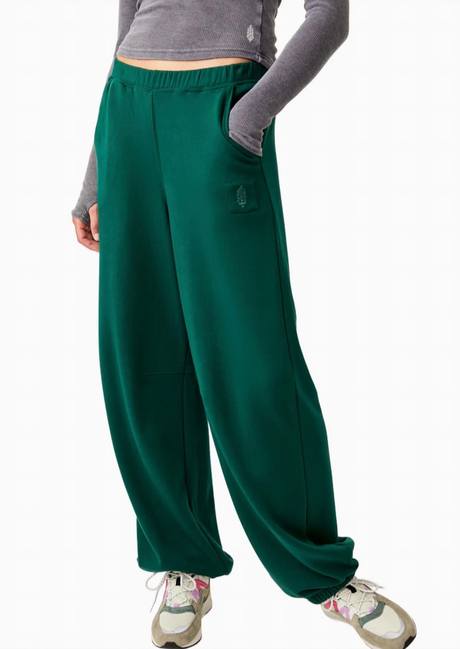 These slouchy, relaxed fit pants feature a high-rise, full-length design with soft terry fabrication. They have a smocked elastic waistband, hand pockets, elasticated cuffs, and a logo patch detail. Made from 51% cotton and 49% polyester French terry, with an unstretched waistband measuring approximately 17", a rise of 15", and an inseam of 30". Machine wash cold.