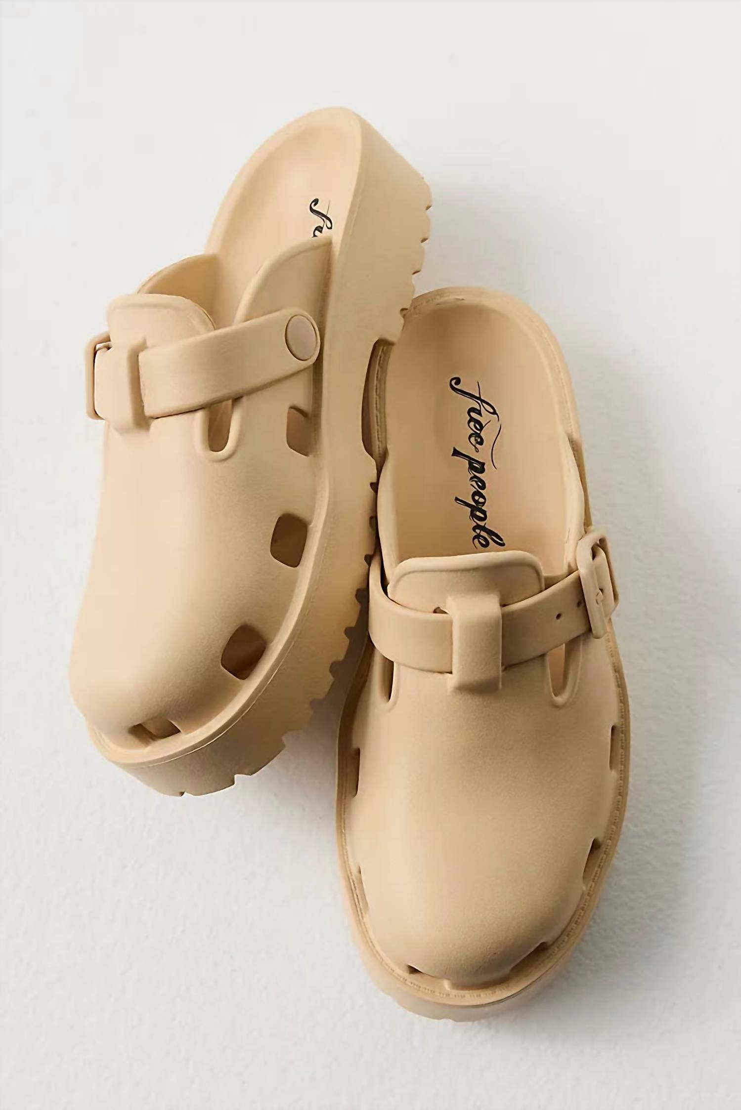 Easy slip-on clogs. Featured in a one-piece molded EVA. Tread platform sole and buckle detail for a comfy stylish pair. Round toe. Cutouts. Adjustable buckle detail.