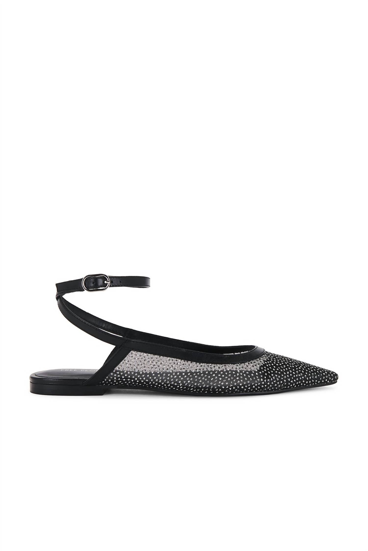 Elevate your footwear collection with the Women's Sheer Glitter Jules Flat by Free People, a chic statement in classic black. This pointed toe flat features a mesh upper interwoven with metallic threads and a synthetic sole, combining elegance and durability. The strapless design offers a secure fit with a fashionable buckle closure at the ankle. Made in India, this flat heel is perfect for maintaining comfort without sacrificing style.
