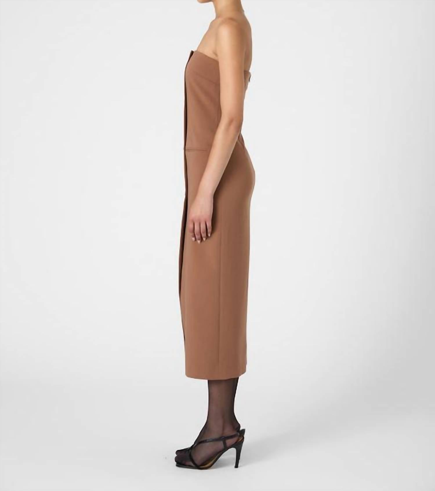 A midi dress so versatile, your options for wearing it are endless. Elevate your style with the Azra Twill Strapless Midi Dress by French Connection, crafted in a solid camel hue. This sheath dress showcases a refined double-breasted button front, sleek strapless design, and a stylish square neckline. Made from twill polyester, it offers a modern midi length and practical features like back zip fastening and two side pockets. Care for this garment with machine wash and line dry instructions, embodying contemporary elegance for the chic woman. Model is 5'11" and wearing a US Size 4.