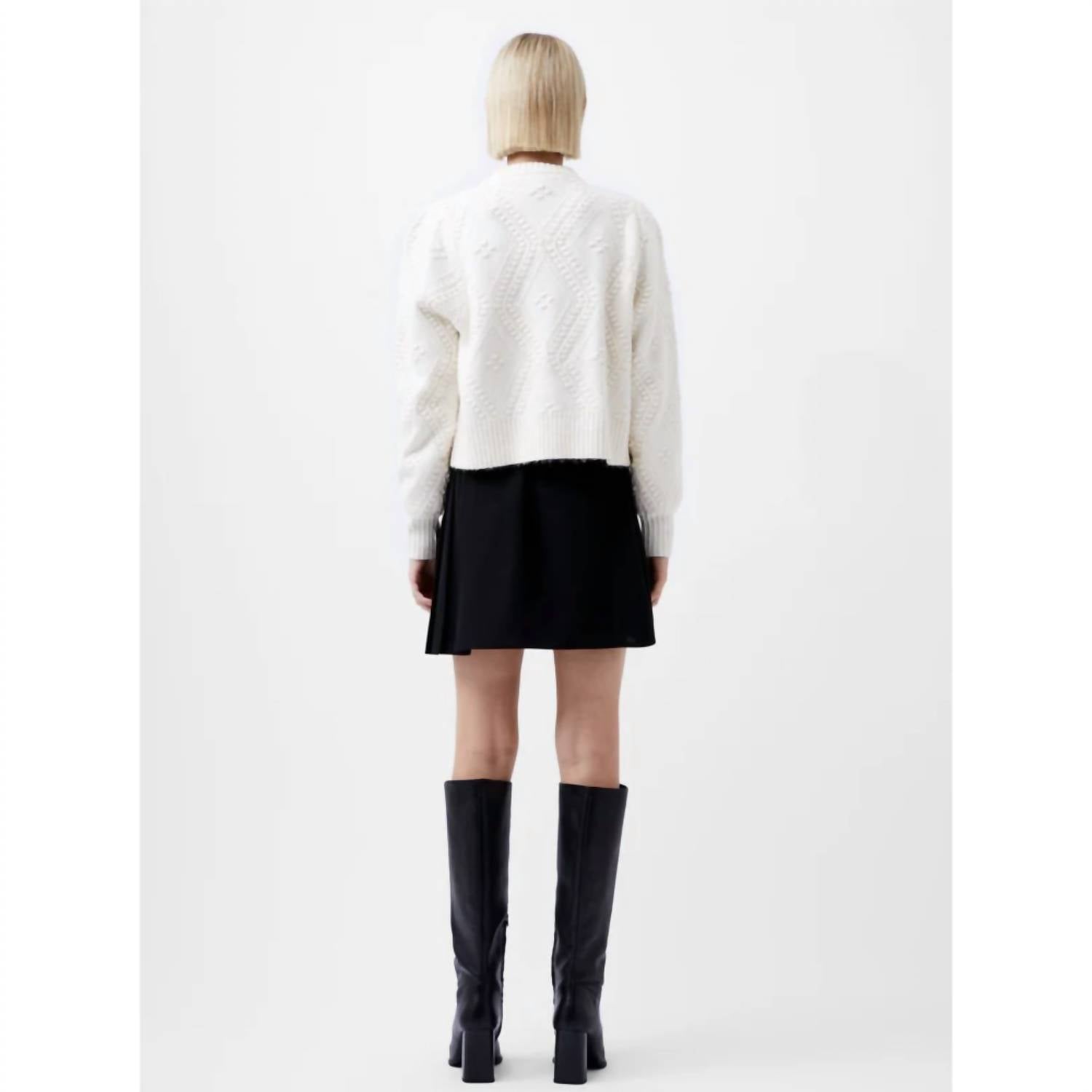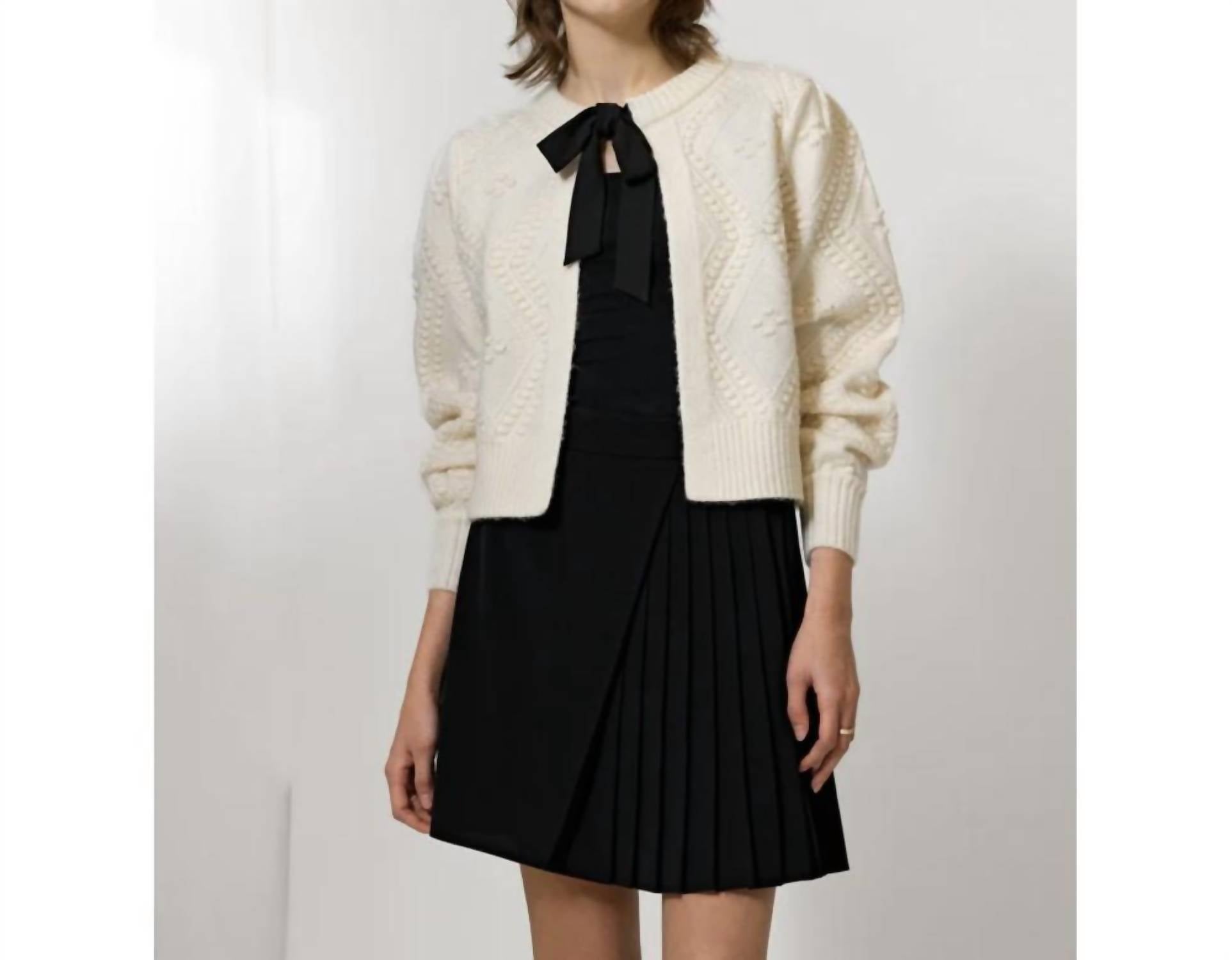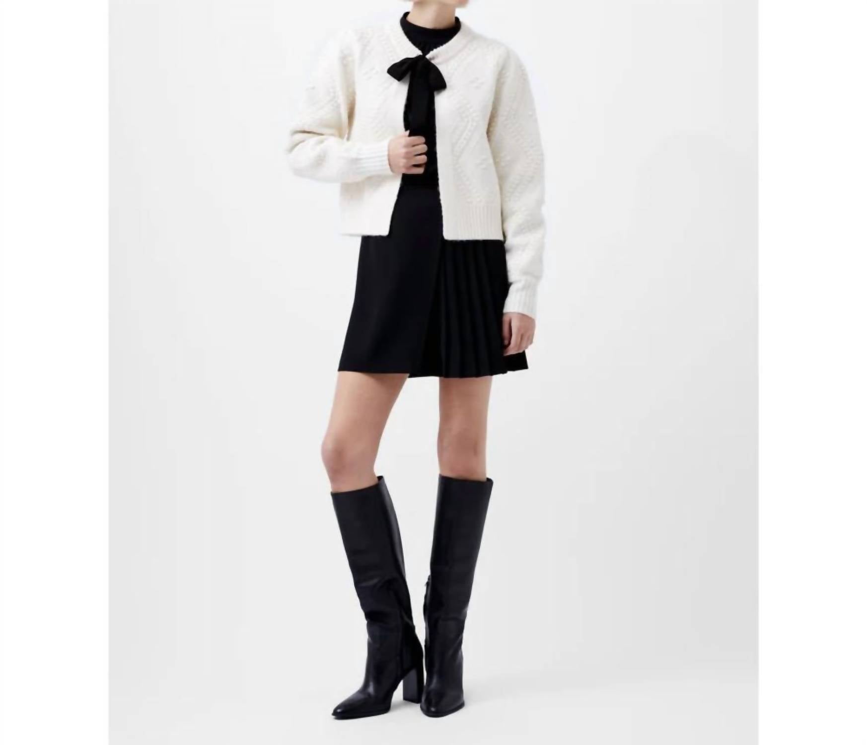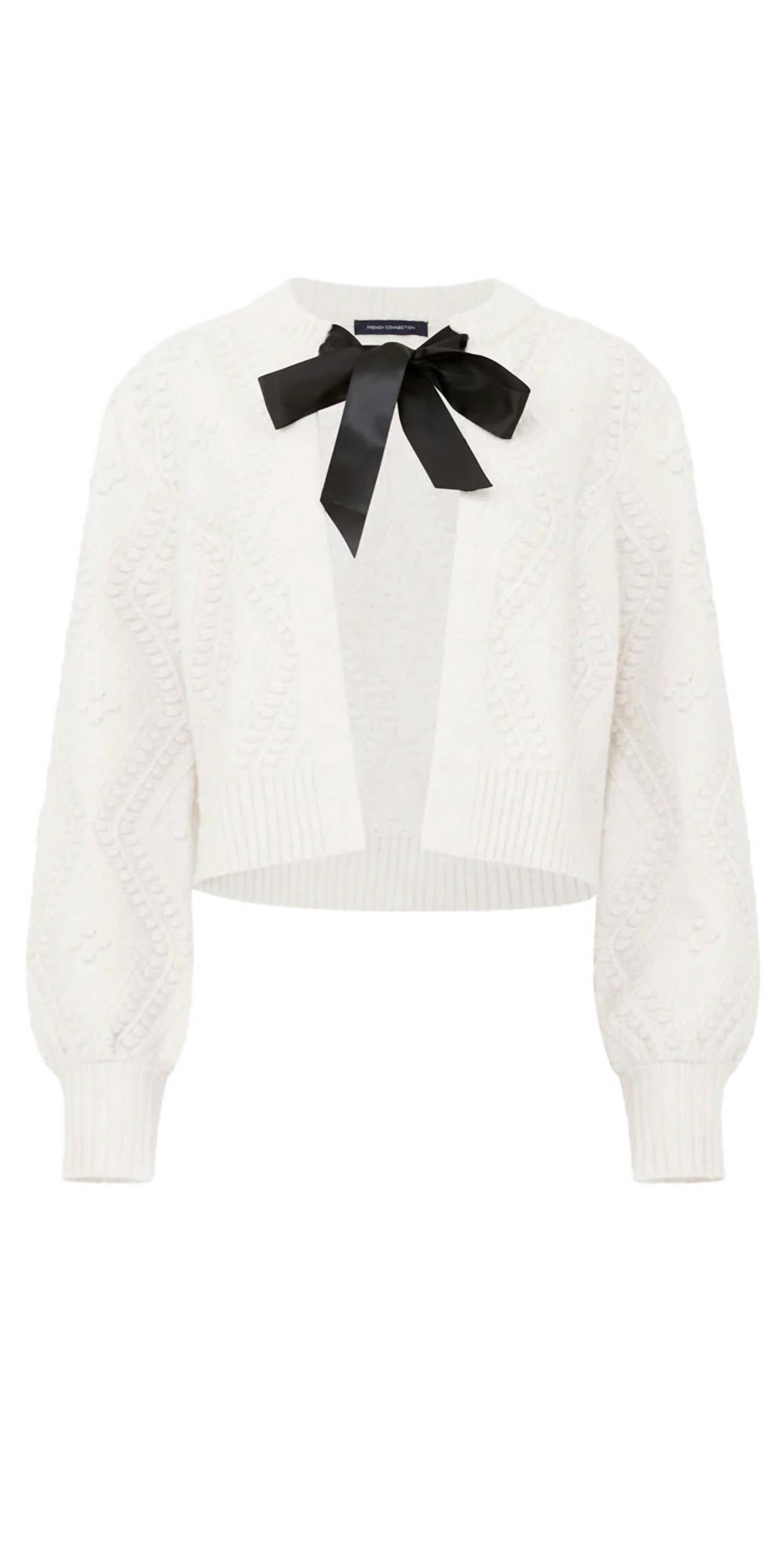 A classic fit that works just as good buttoned as it does left open. Introducing the Kitty Bobble Bow Cardigan by FRENCH CONNECTION, a chic choice for your spring wardrobe in a classic off-white hue. This women's cardigan features long sleeves and a textured pattern that exudes minimalist charm. Crafted from polyester, it has a pull-on closure and crewneck for easy wear. To maintain its quality, hand wash and lay flat to dry.
