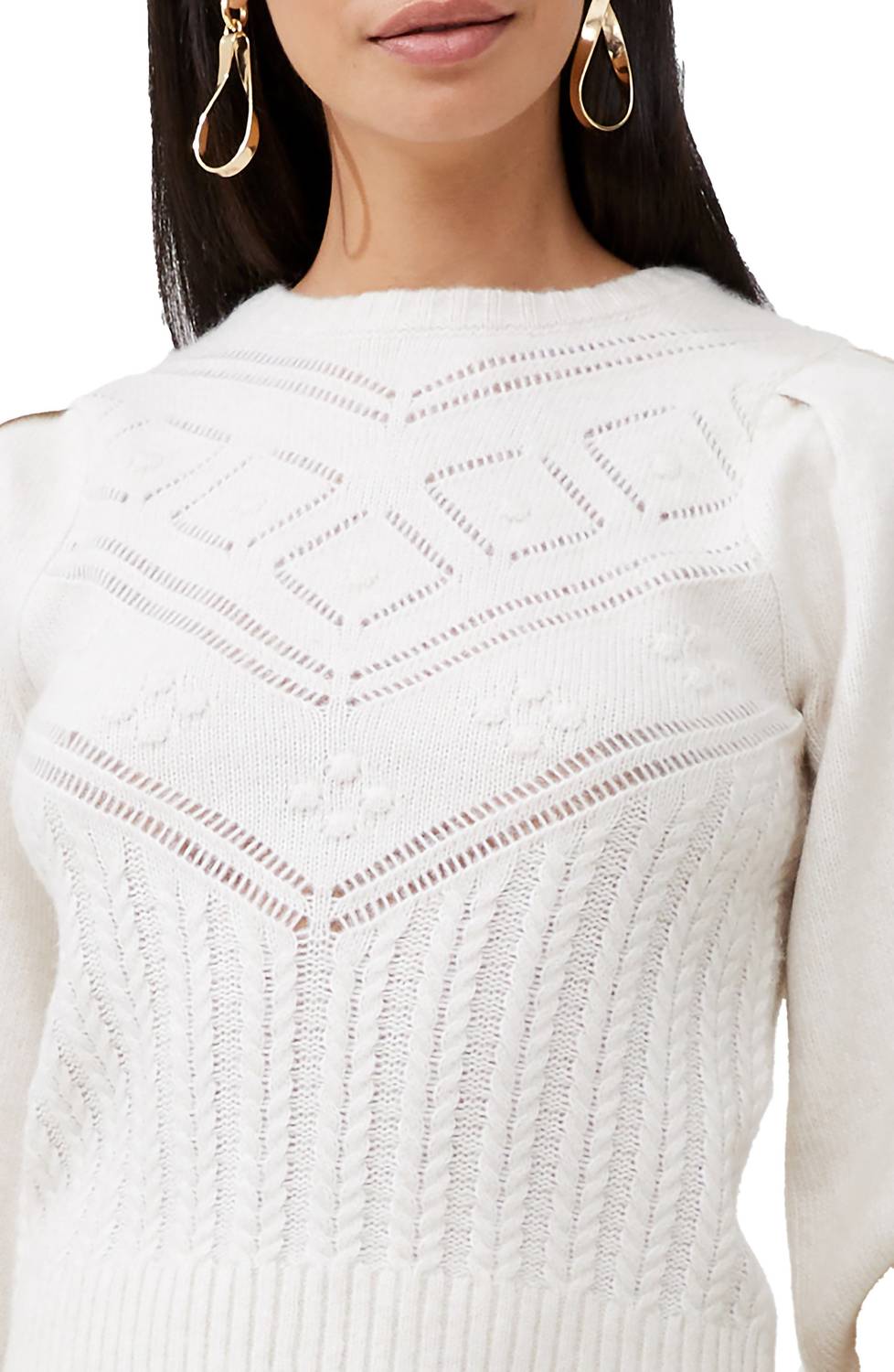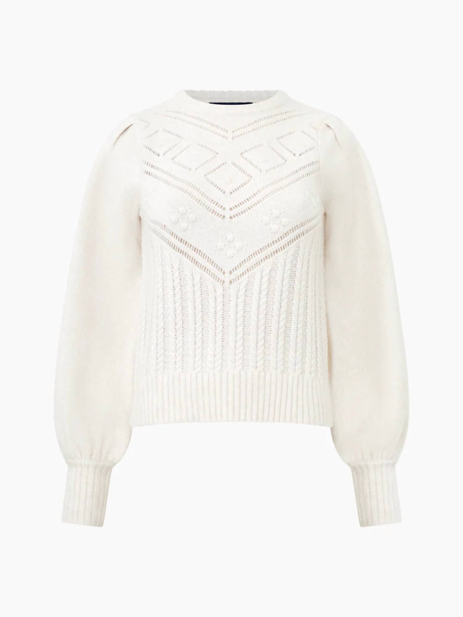 You'll be reaching for this comfy and classic v-neck sweater all season long. Embrace elegance with the Kitty Jumper Sweater by French Connection, a must-have for your collection this season. This Oatmeal piece is crafted from a recycled blend polyester that features a striking textured decorative pattern. Designed with long balloon sleeves and a classic crew neckline, this 21.26-inch regular fit jumper is perfect for adding a touch of class to any outfit. Easy pull-on closure provides comfort and style, making it ideal for a holiday party or minimalist Thanksgiving look.
