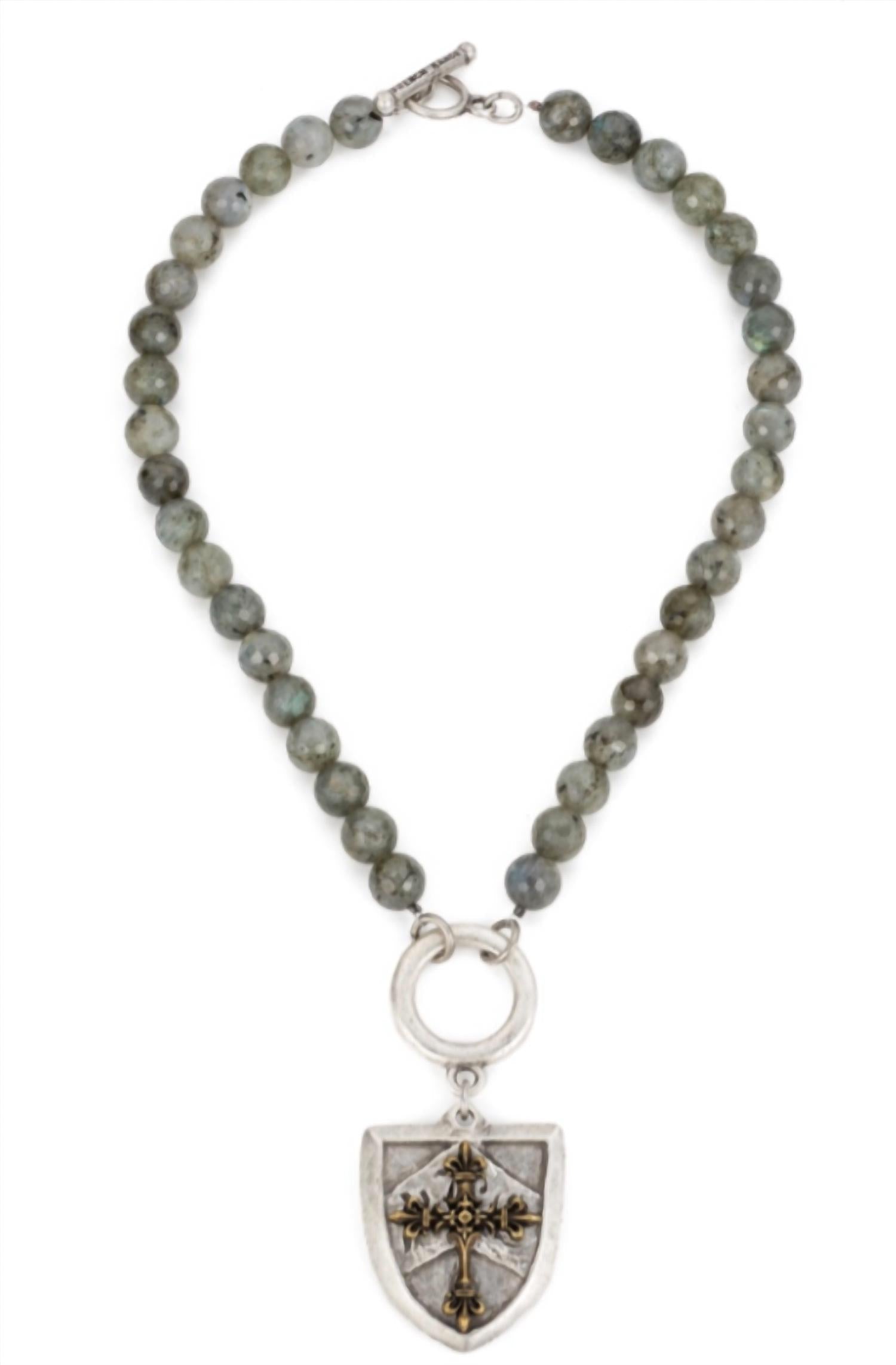 Both understated and impactful, you'll be reaching for this one-of-a-kind necklace season after season. This necklace features 17” of faceted Grey Labradorite with silver toggle and Cheval Cross Stack medallion. Absolutely beautiful all by itself or layered with our other designs. • Strand Length: Short, 17” • Stone Size: 10 mm • Sterling Silver and Brass Plated • Each piece of French Kande is handmade in our Los Angeles studio by Californian artisans.