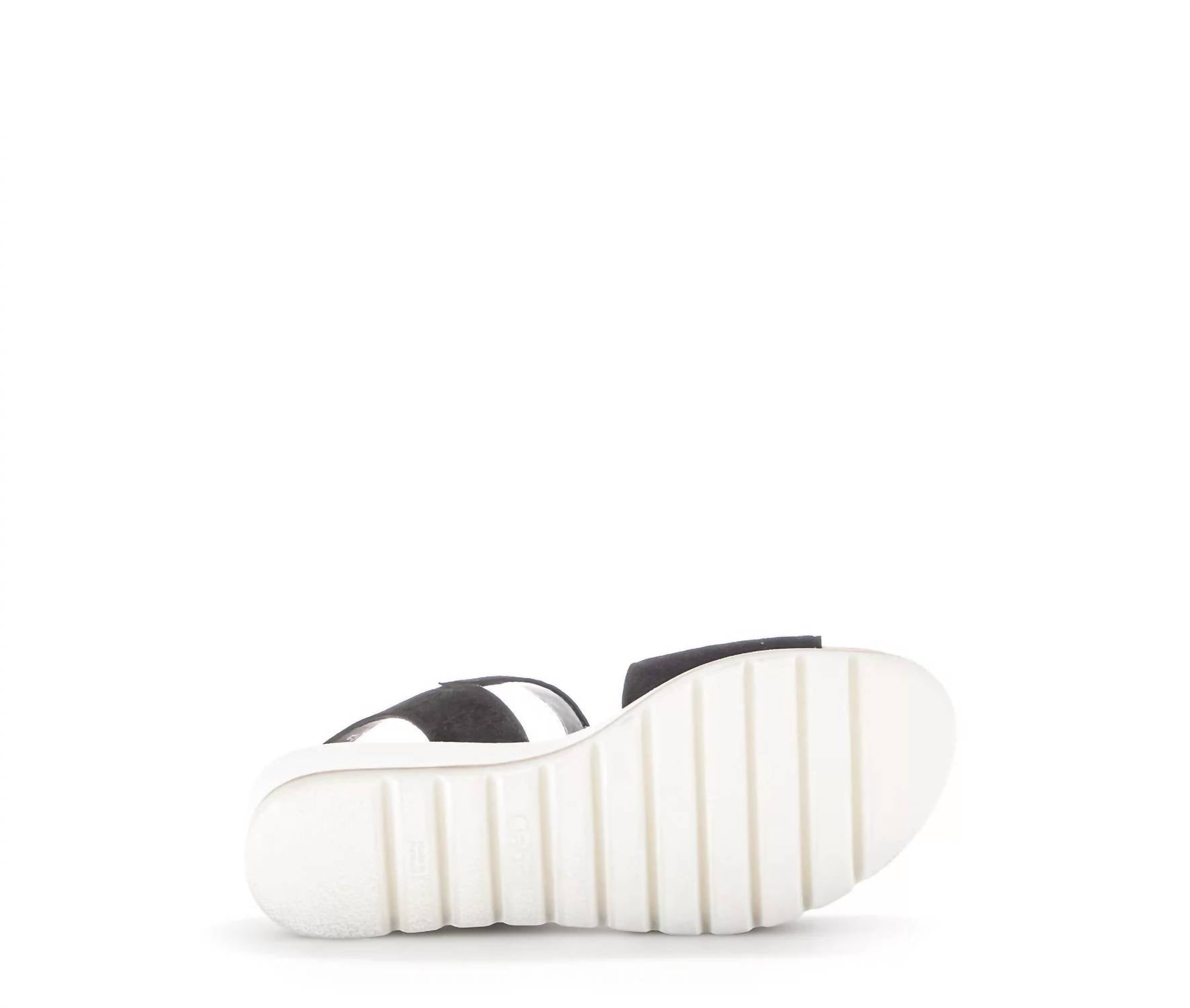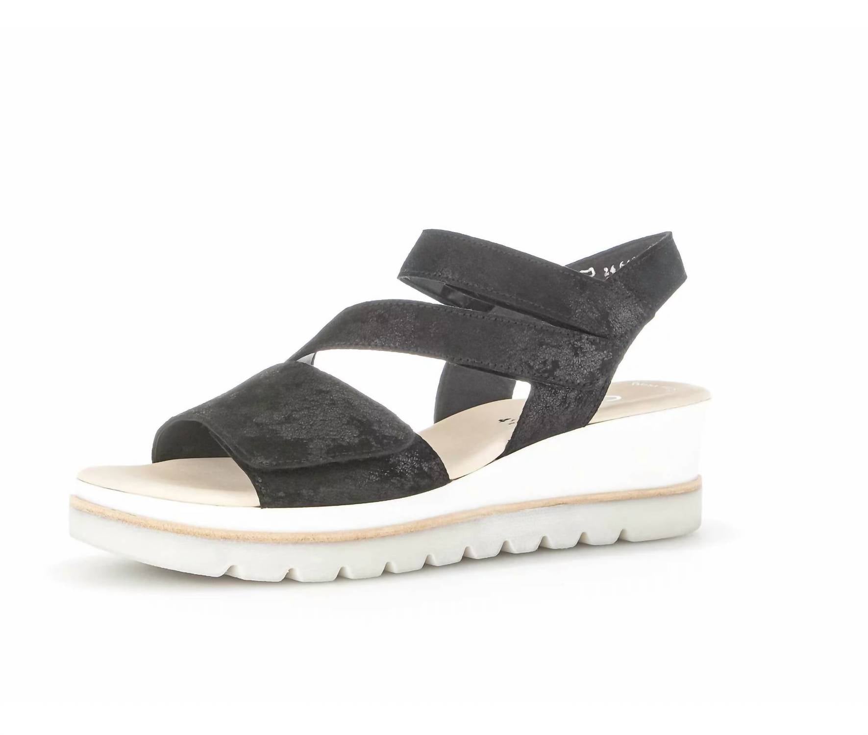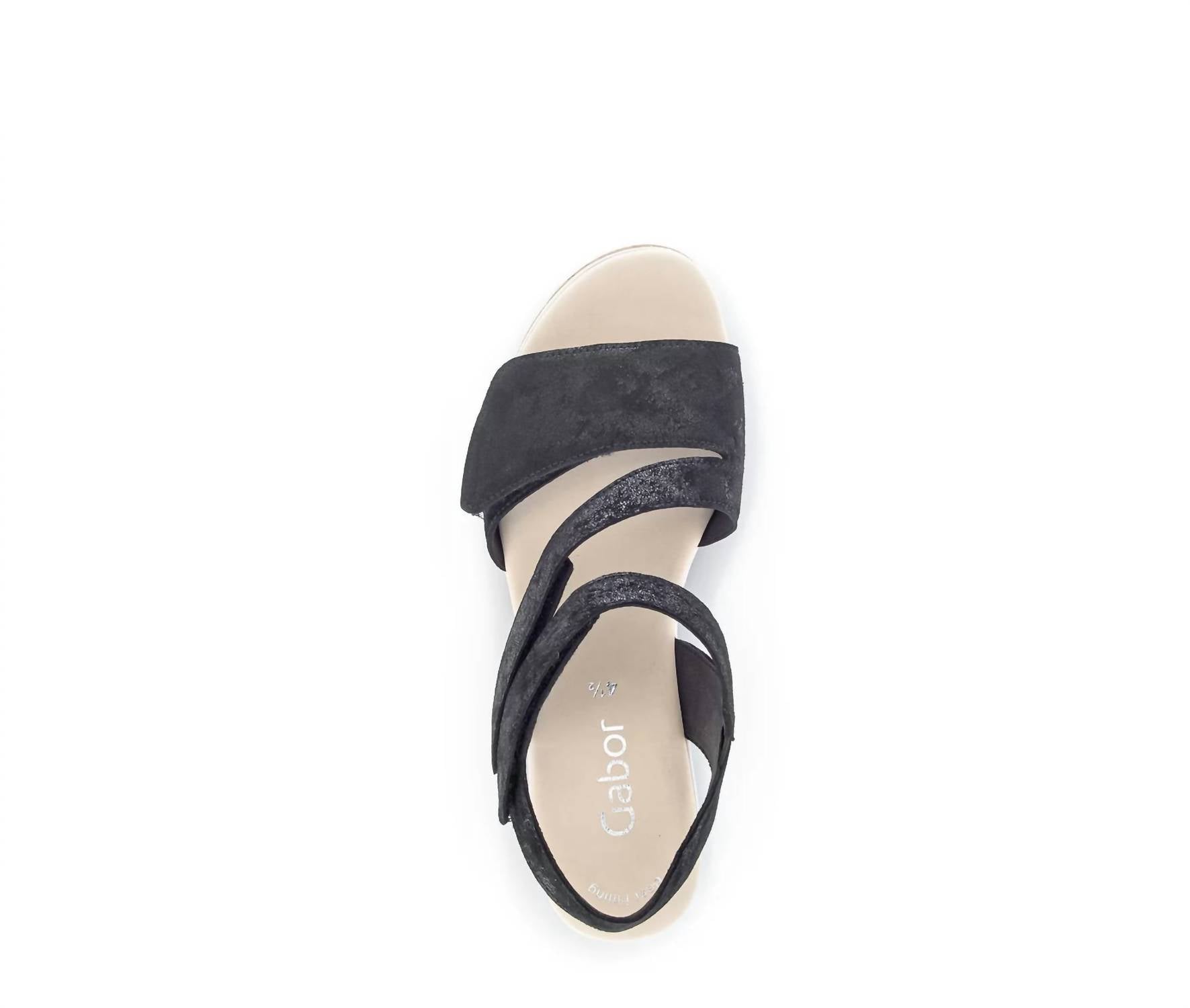 Flowy dresses, cropped pants, and even jumpsuits... this sandal works with them all! Discover the Gabor Women's 24.640.67 Caruso Metallic Sandal, a stylish addition to any summer wardrobe. This sandal from Gabor Fashion features a chic black effect leather upper with a modern wedge heel, providing a comfortable 5 cm lift. The sandal's design is completed with an open, round shoe tip and convenient Velcro closure for easy wear. Lined with textile and crafted in Europe, this minimalist sandal is perfect for a dinner party or Thanksgiving occasion.