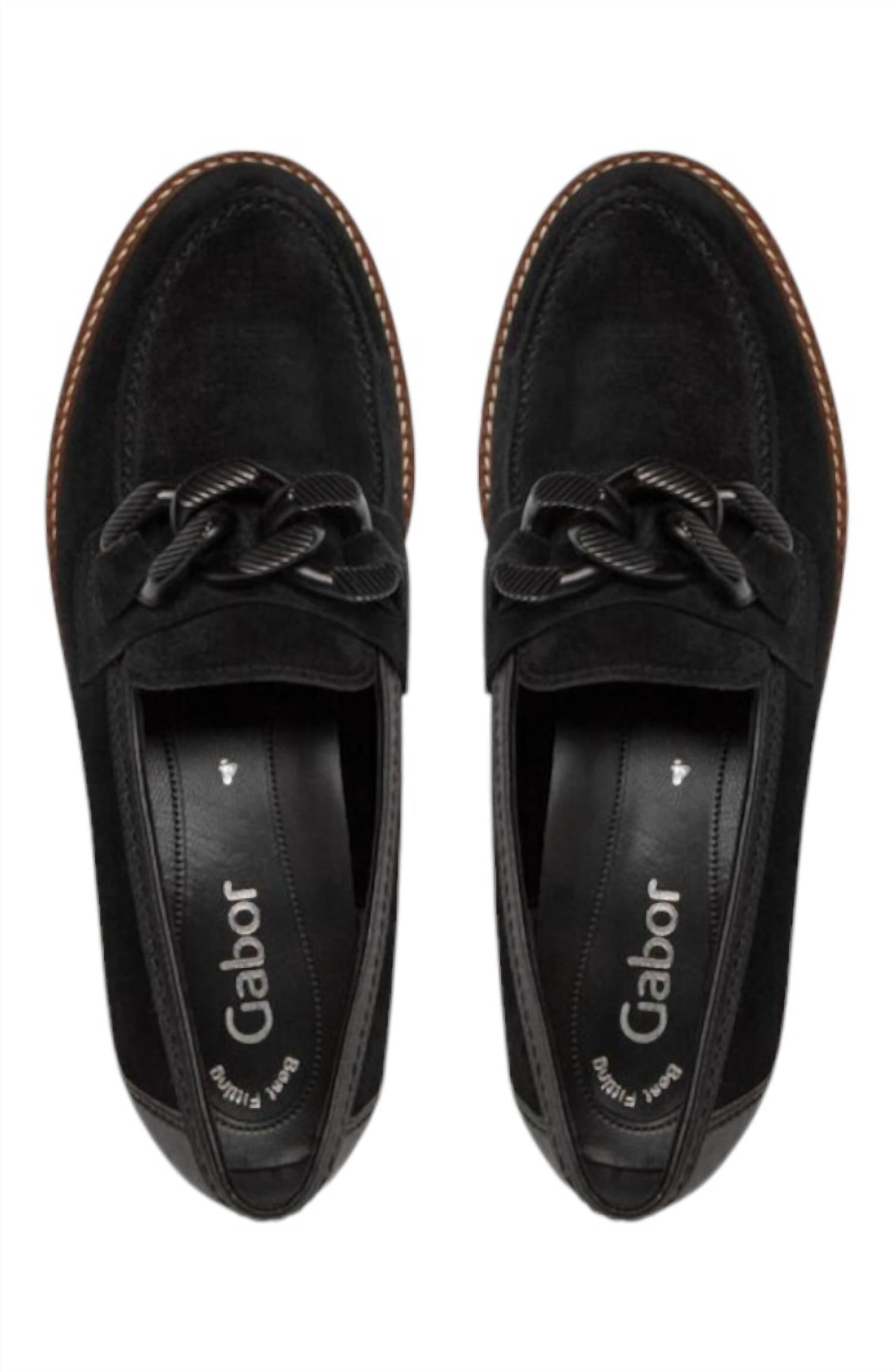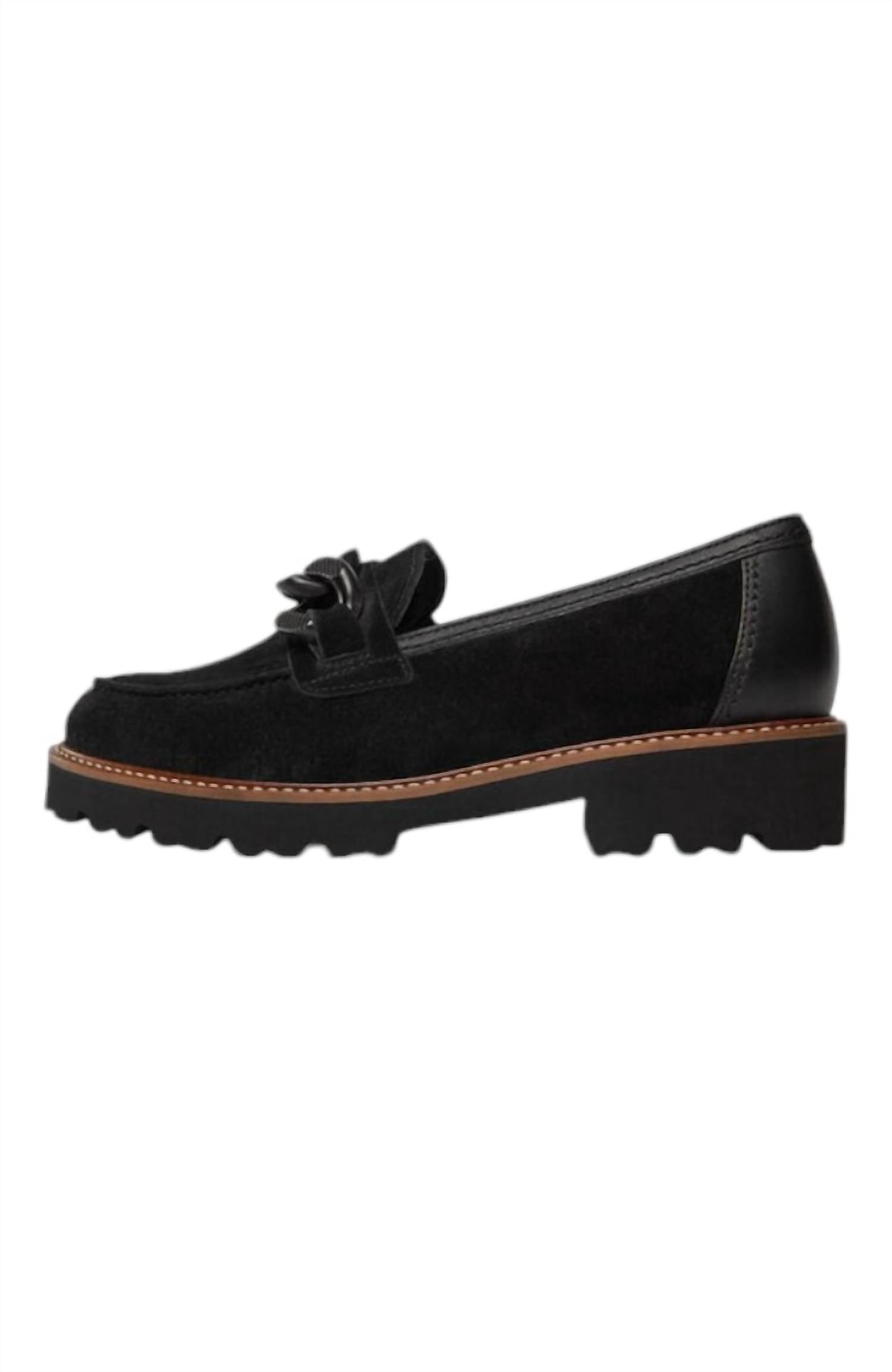 Suede lug sole loafer with chunky chain detail. Soft texture and intricate craftsmanship. Tan accents for added sophistication. Option to add a fit pack for narrow feet or a snug fit.