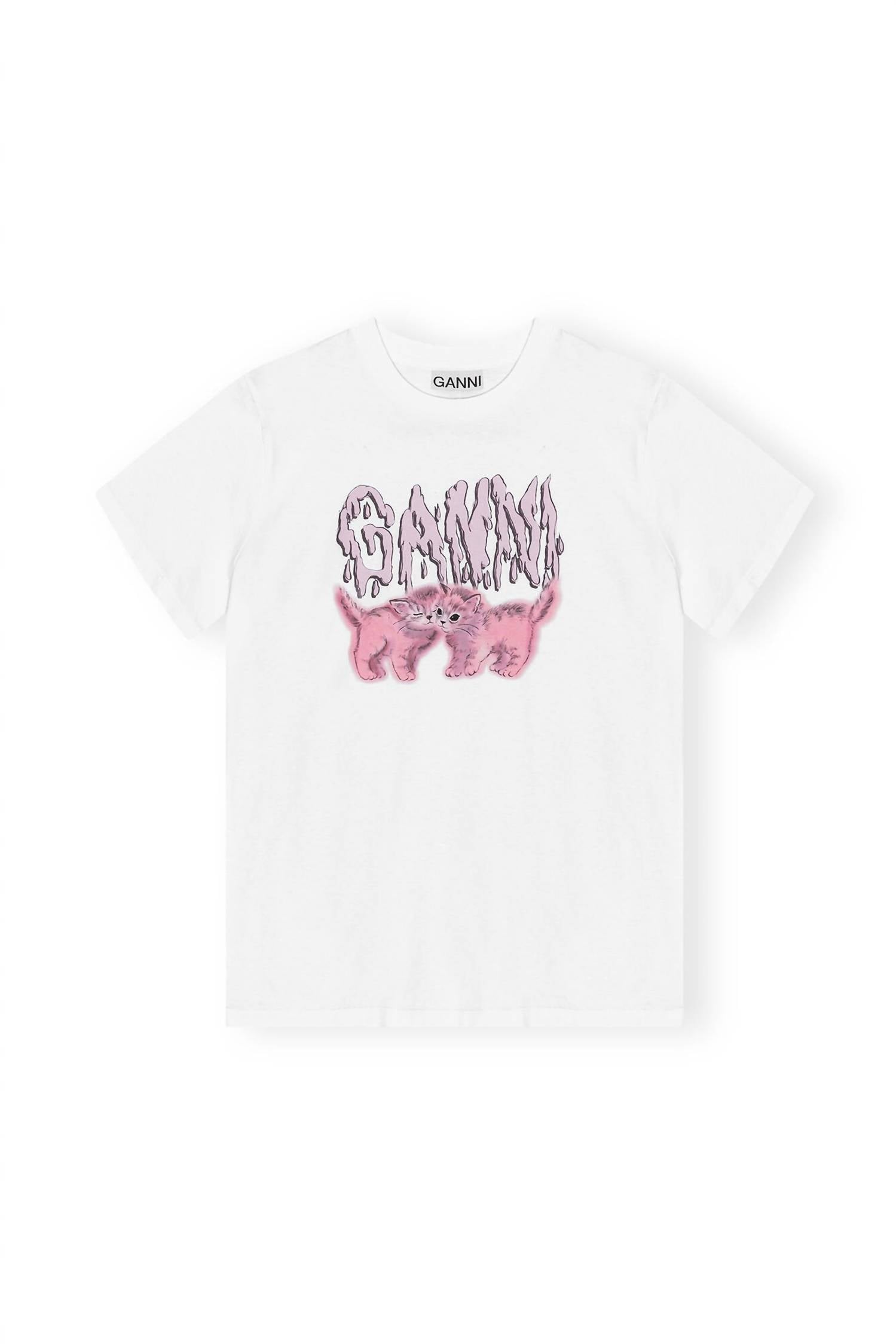 This women's tee features short sleeves and a crewneck, adorned with a distinctive graphic GANNI print. Made from 100% organic cotton, it offers a comfortable and eco-friendly choice. Closure: Pull-on.