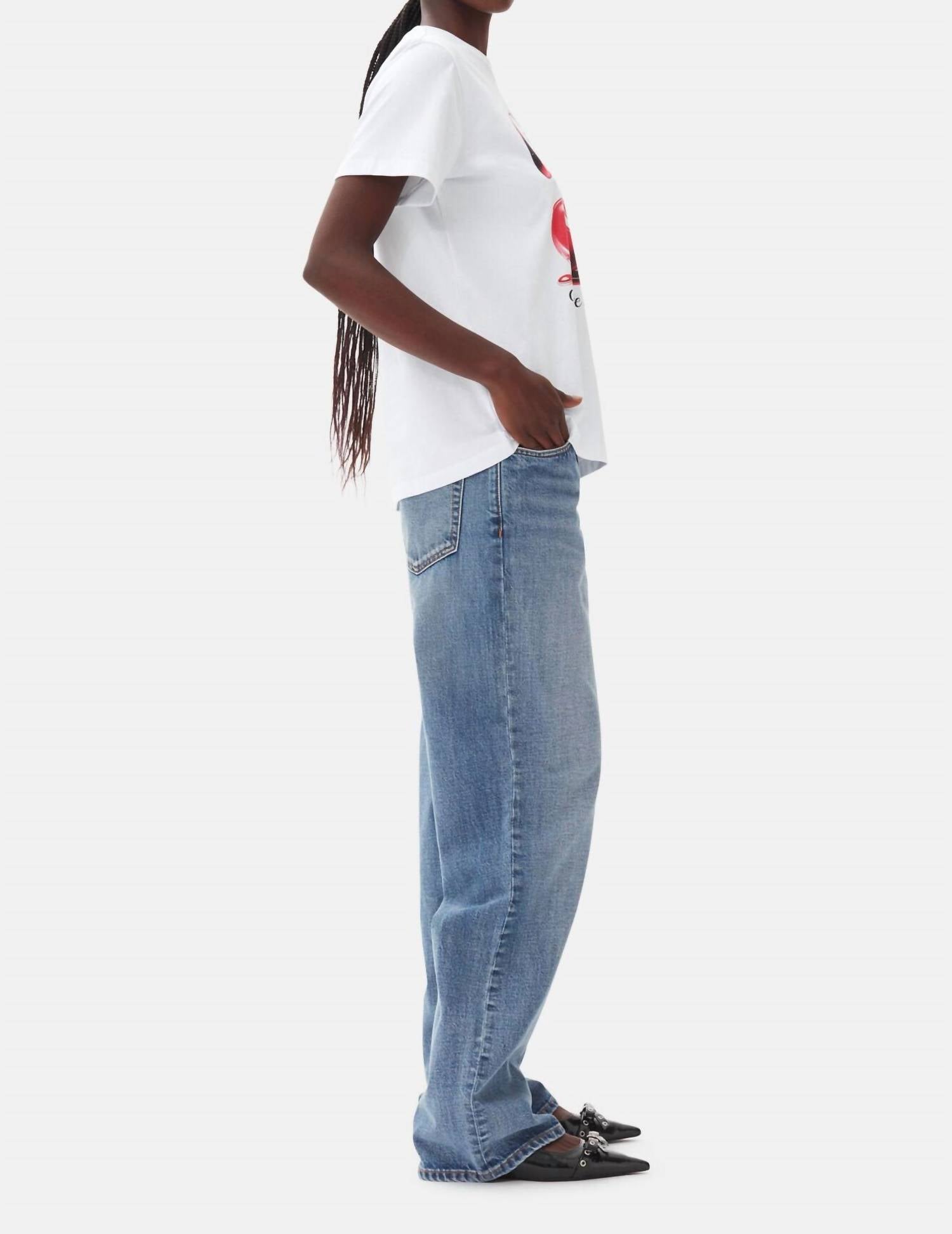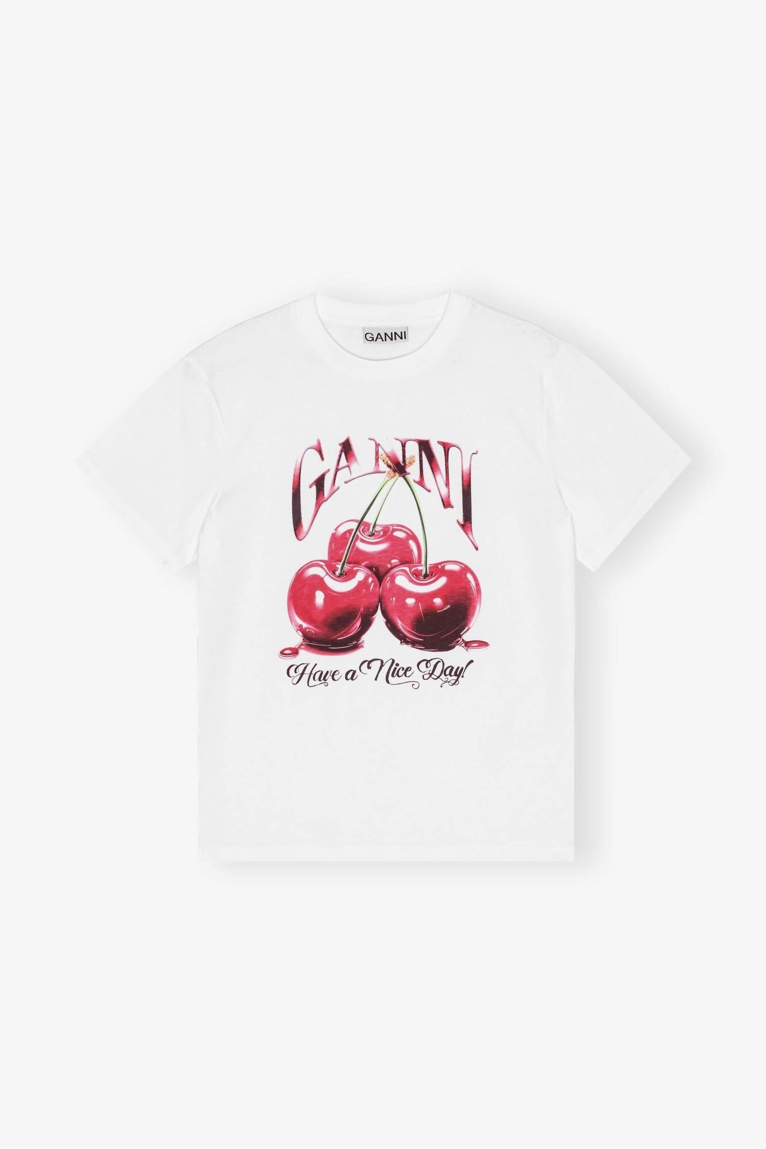 Introducing the GANNI Basic Jersey Cherry Relaxed T-shirt, a statement piece in bright white designed for women's streetwear style. This T-shirt features short sleeves, a crew neckline, and a playful graphic print with cherries, emphasizing a relaxed fit. Composed of 100% organic cotton, this piece originates from Portugal and offers a pull-on closure for easy wear. Care: Machine wash cold, do not bleach, do not tumble dry, iron low, do not dry clean. Wash and iron inside out, and wash with similar colors.