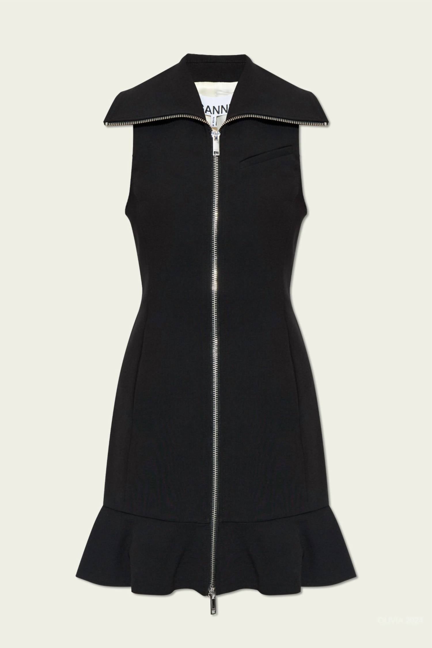 The kind of easy and flattering dress you'll be reaching for all season long. Presenting the Bonded Crepe Mini Dress by GANNI, a chic and sustainable addition to your wardrobe. Crafted from 100% recycled polyester, this sleeveless bodycon mini dress offers an elegant black solid color with a classic collar. Made in China, the dress features a convenient zip closure and includes pockets for added functionality. Please note this product is based on European sizing.