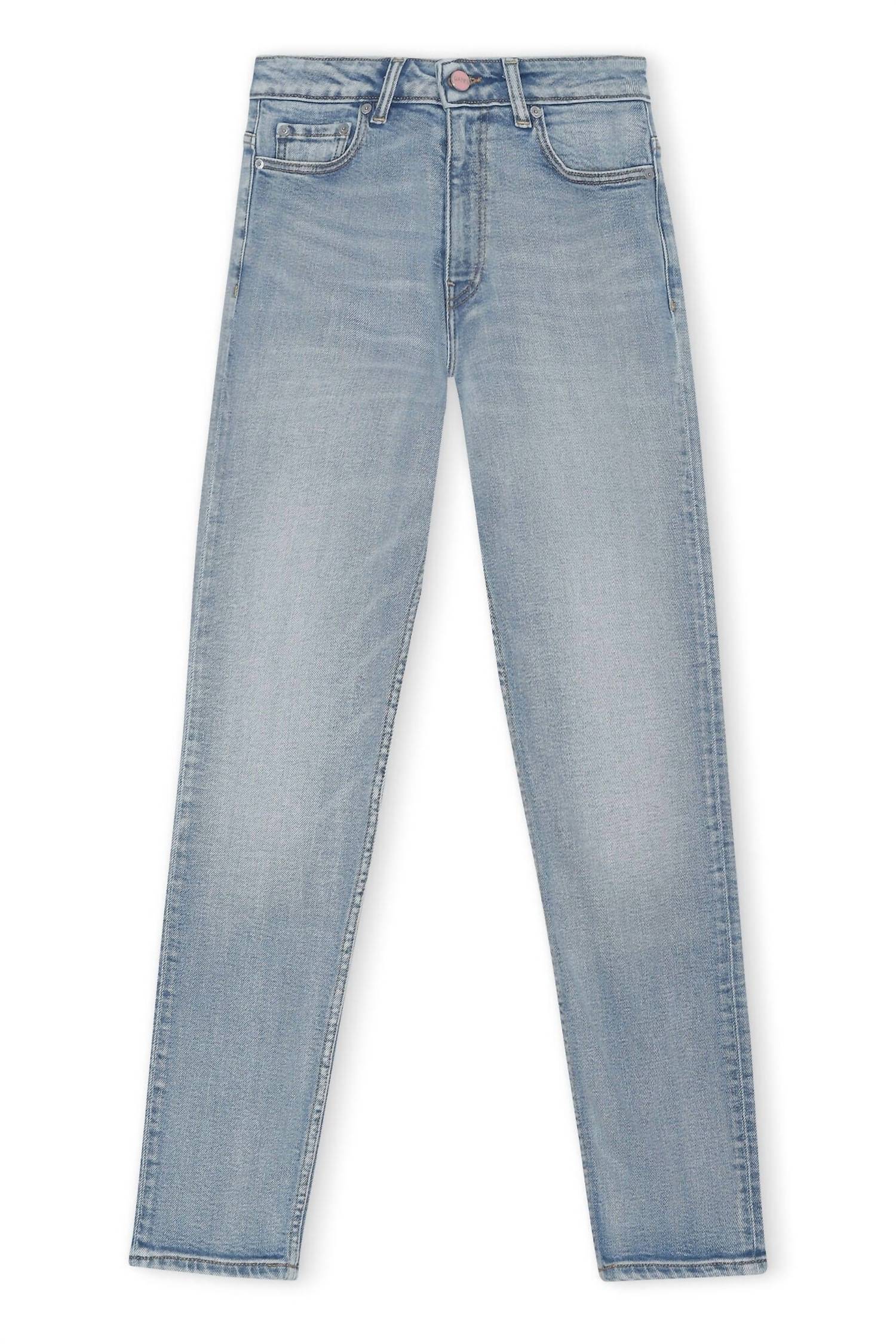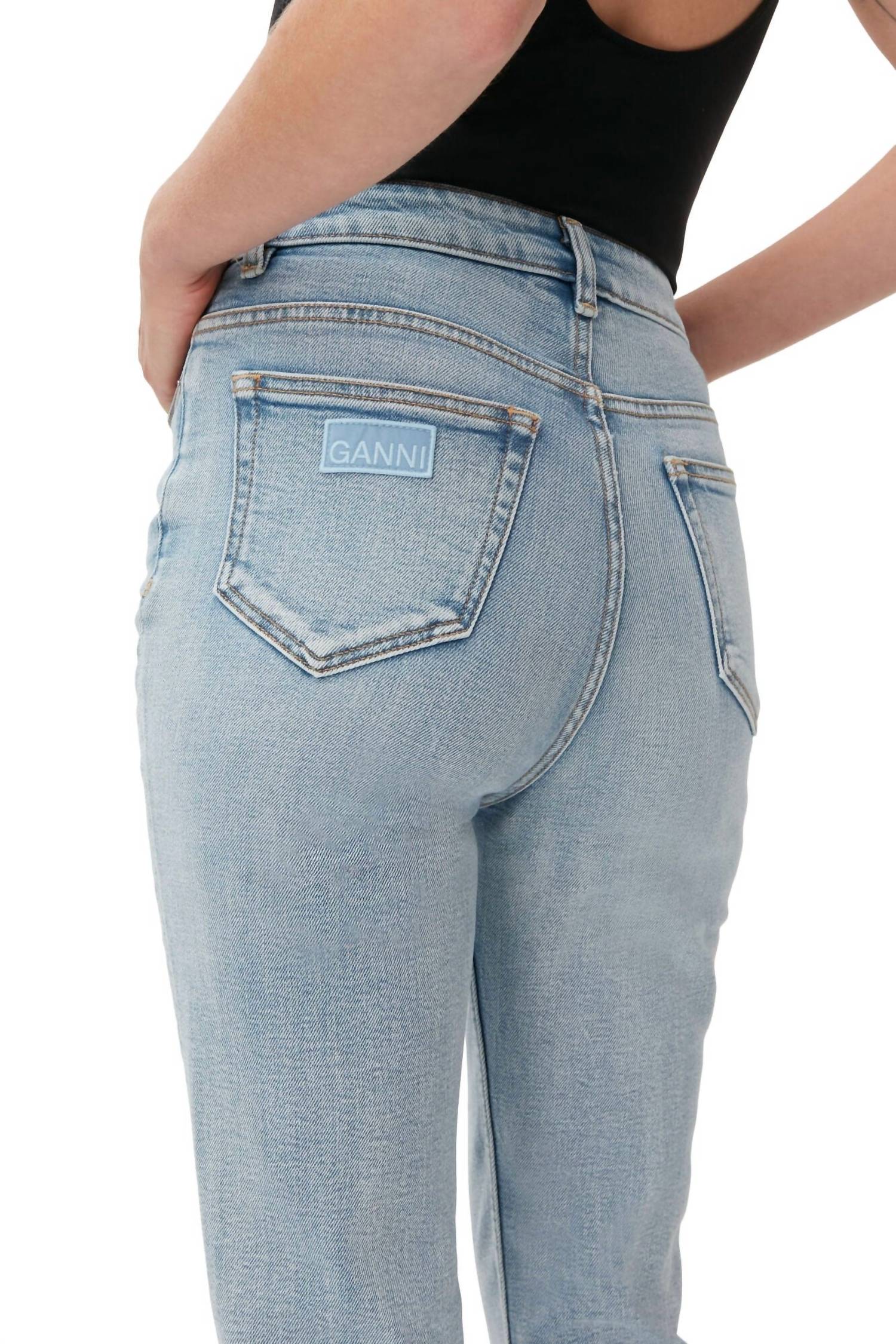 Staple piece from Core Denim collection. Crafted from 100% organic cotton in a light blue vintage wash. Offer unparalleled comfort with a high-rise and slim fit. Slightly cropped, straight-leg cut is complemented by a 5-pocket style with belt loops and a zip/button closure. Finished with a GANNI logo rubber patch on the back pocket. Perfect blend of style and sustainability.