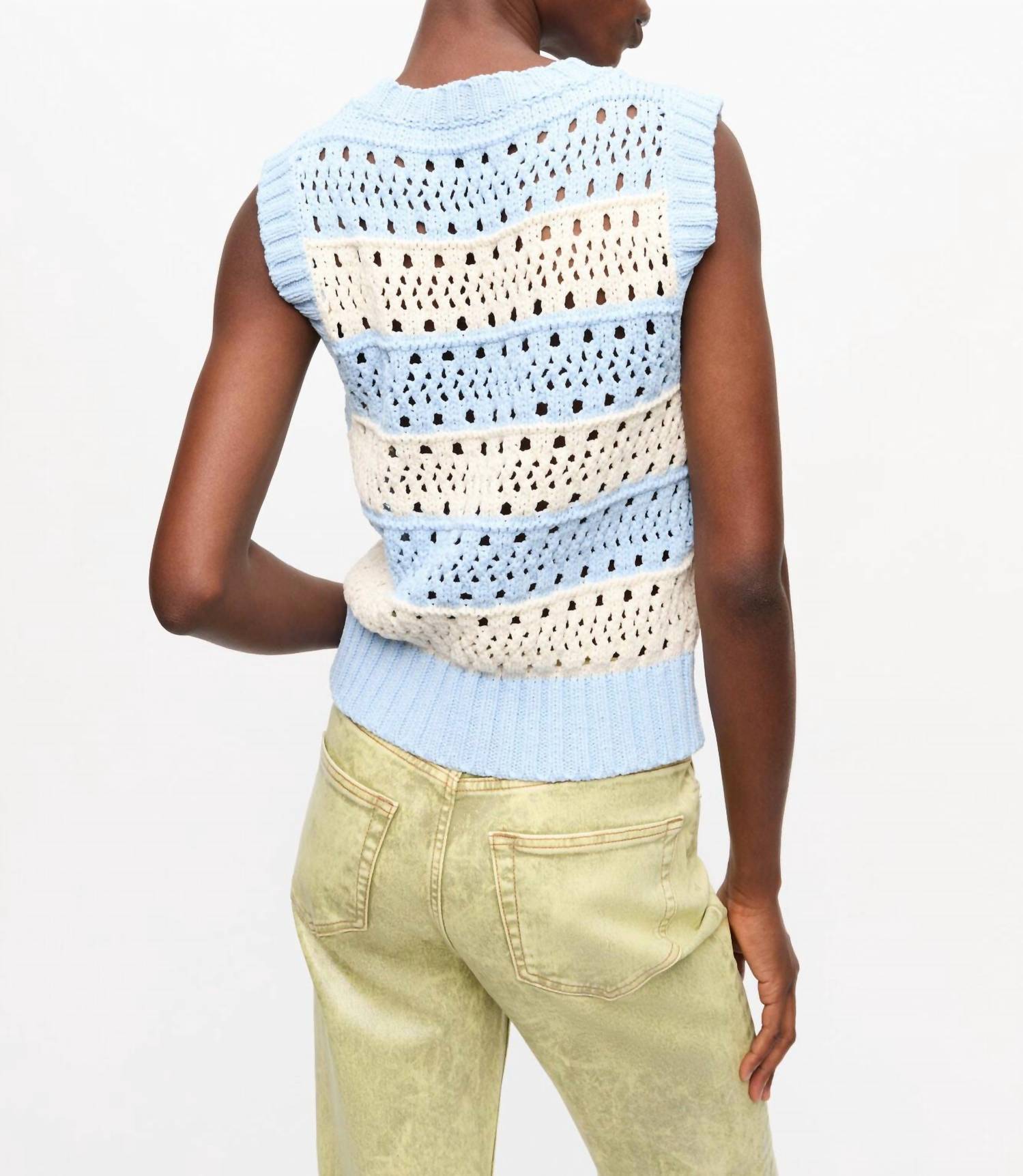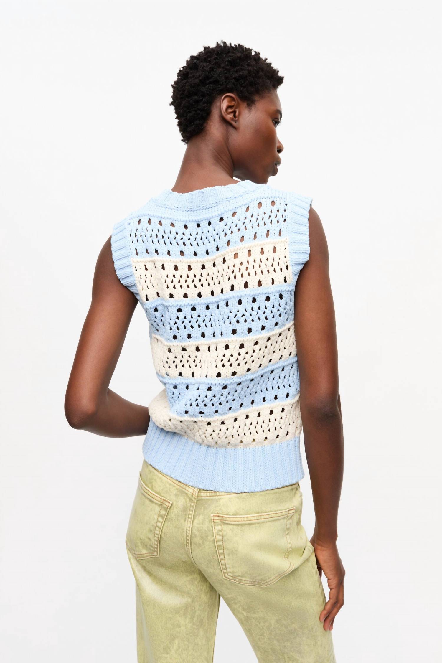 Introducing the Cotton Crew Neck Vest by GANNI, a chic choice for a preppy look. This soft chambray vest is sleeveless and made from 50% recycled cotton and 50% recycled polyester, featuring a textured pattern and the iconic GANNI logo. It has a comfortable pull-on closure and is perfect for vacation or Thanksgiving gatherings. Care instructions are simple, with machine wash and line dry advised to maintain its quality.