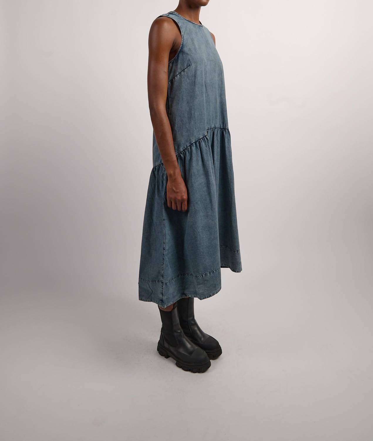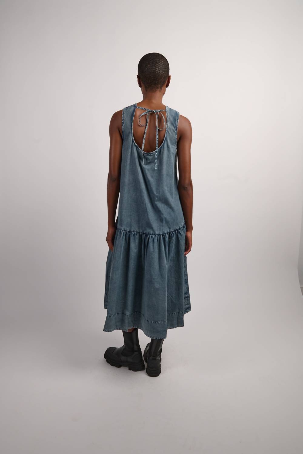 The perfect length dress does exist. Meet the Cotton Poplin Open Back Midi Dress by GANNI, a stylish addition to your wardrobe in the chic Sky Captain shade. This sleeveless, organic cotton dress offers a round neckline and features an eye-catching open back with a tie detail. The relaxed A-line silhouette and gathered, slightly flared skirt bring a touch of elegance to any occasion. Crafted in India, this pull-on dress is easily maintained with machine wash and line dry instructions.