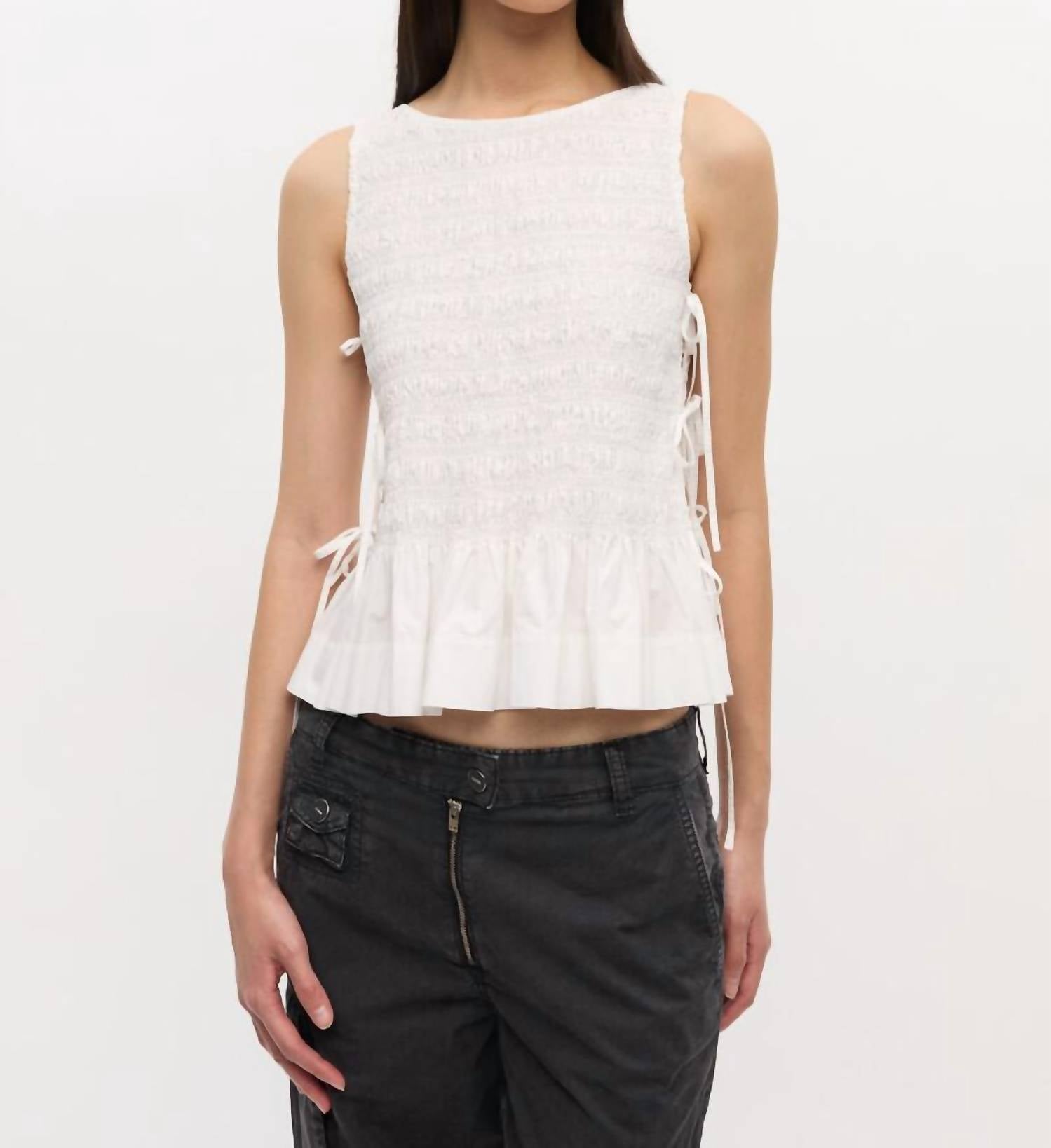 A versatile blouse that works from desk to dinner! Introducing the Cotton Poplin Smock Tie String Top by GANNI in elegant Snow White, perfect for your vacation wardrobe. This sleeveless top features a stylish crew neck, peplum waist, and a feminine ruffled hem. Crafted entirely from 100% textured cotton fabric, it includes side tie fastenings for a customizable fit. Care: Hand wash and line dry for best results.