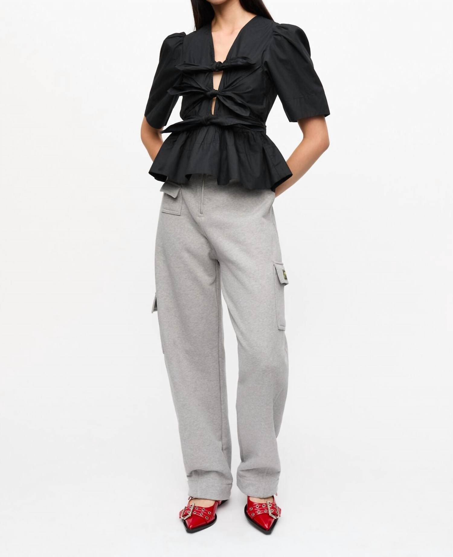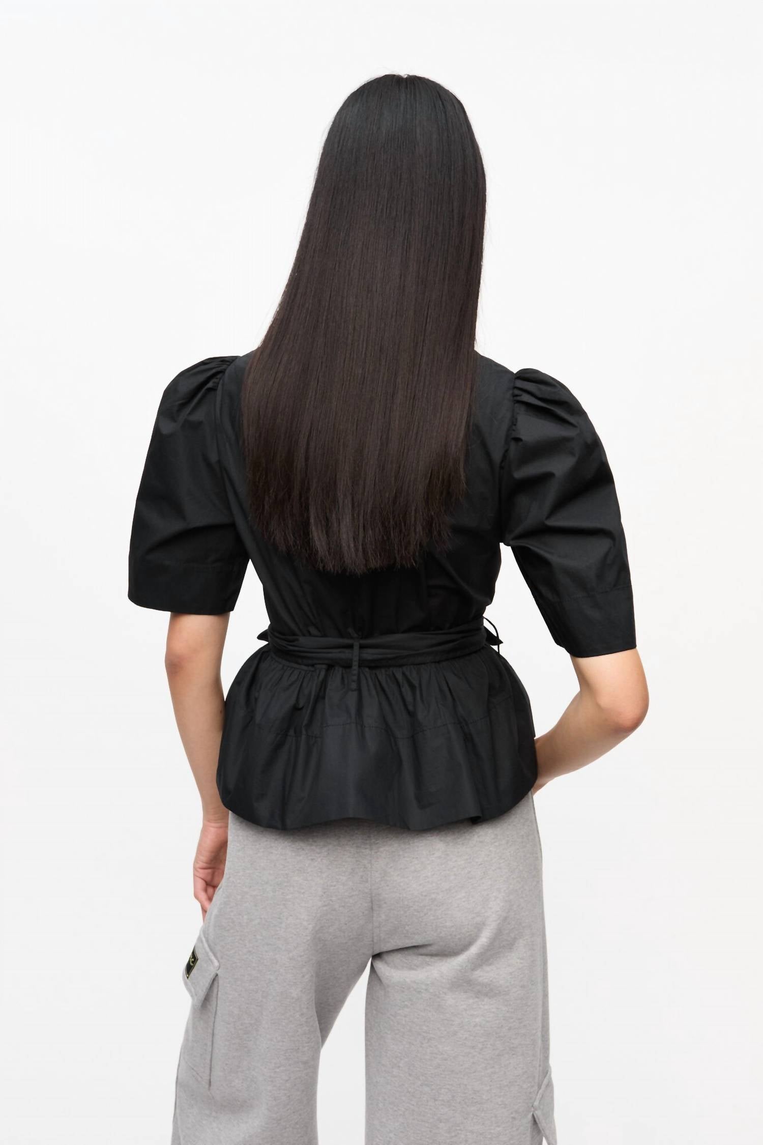 Pair this with your favorite jeans and slides for your next girls night out. Discover the GANNI Women's Tie Strap Blouse, a chic addition to your summer wardrobe. Crafted from a blend of 97% cotton and 3% elastane, this blouse features short, puffed sleeves and a sophisticated deep V-neckline. Its solid black design is complemented by three tie straps at the front, offering a stylish twist to a monochrome trend. With a convenient pull-on closure, this blouse is perfect for vacation-ready ensembles.