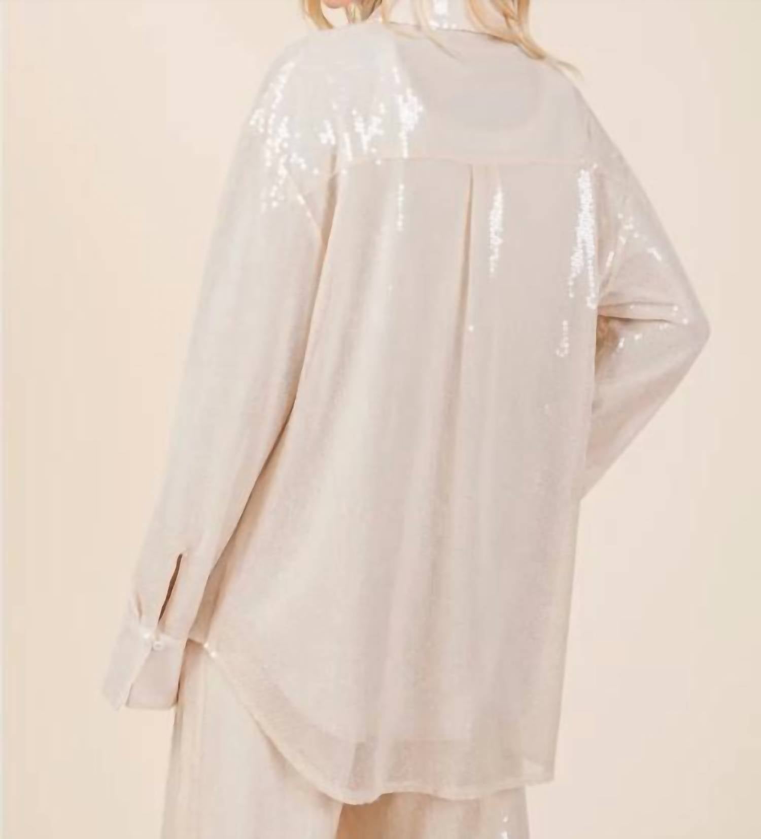 Pair this with your favorite jeans and slides for your next girls night out. Elevate your evening ensemble with the Sequin Oversized Button Up Blouse by GEEGEE, a standout piece in elegant cream. This long-sleeve shirt features clear sequin detailing and a textured pattern, exuding a sense of quiet luxury. The blouse offers a collared neckline and a comfortable oversized fit, perfect for a sophisticated spring event or Thanksgiving celebration. Closure: Button closure.
