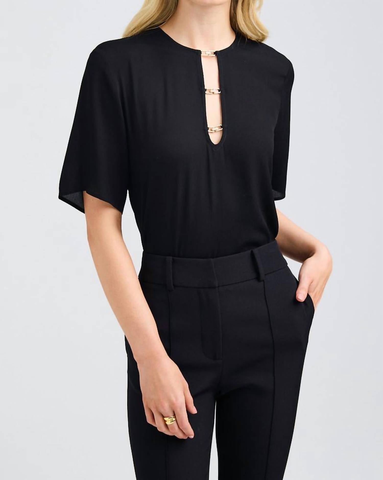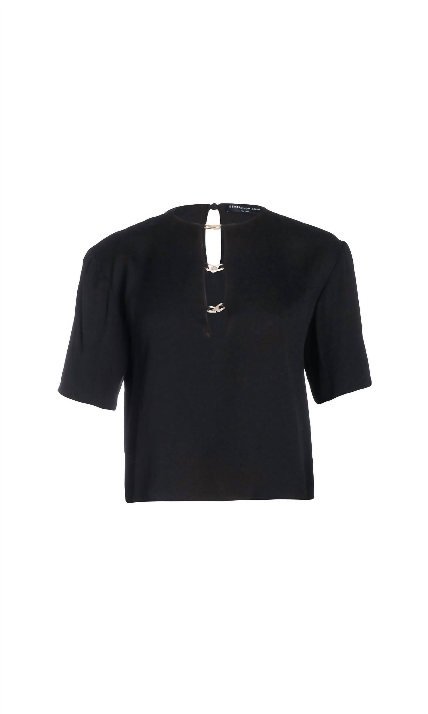 A versatile blouse that works from desk to dinner! Elevate your wardrobe with the Romano Blouse by Generation Love, a sophisticated piece in solid black. This blouse features short sleeves and a distinctive V-neckline adorned with pretty crystal chain link closures. Made from 100% viscose, it offers a flowy fit with a length of 20 inches and uses shank buttons for closure. Care involves hand washing and line drying to maintain its elegant appeal.