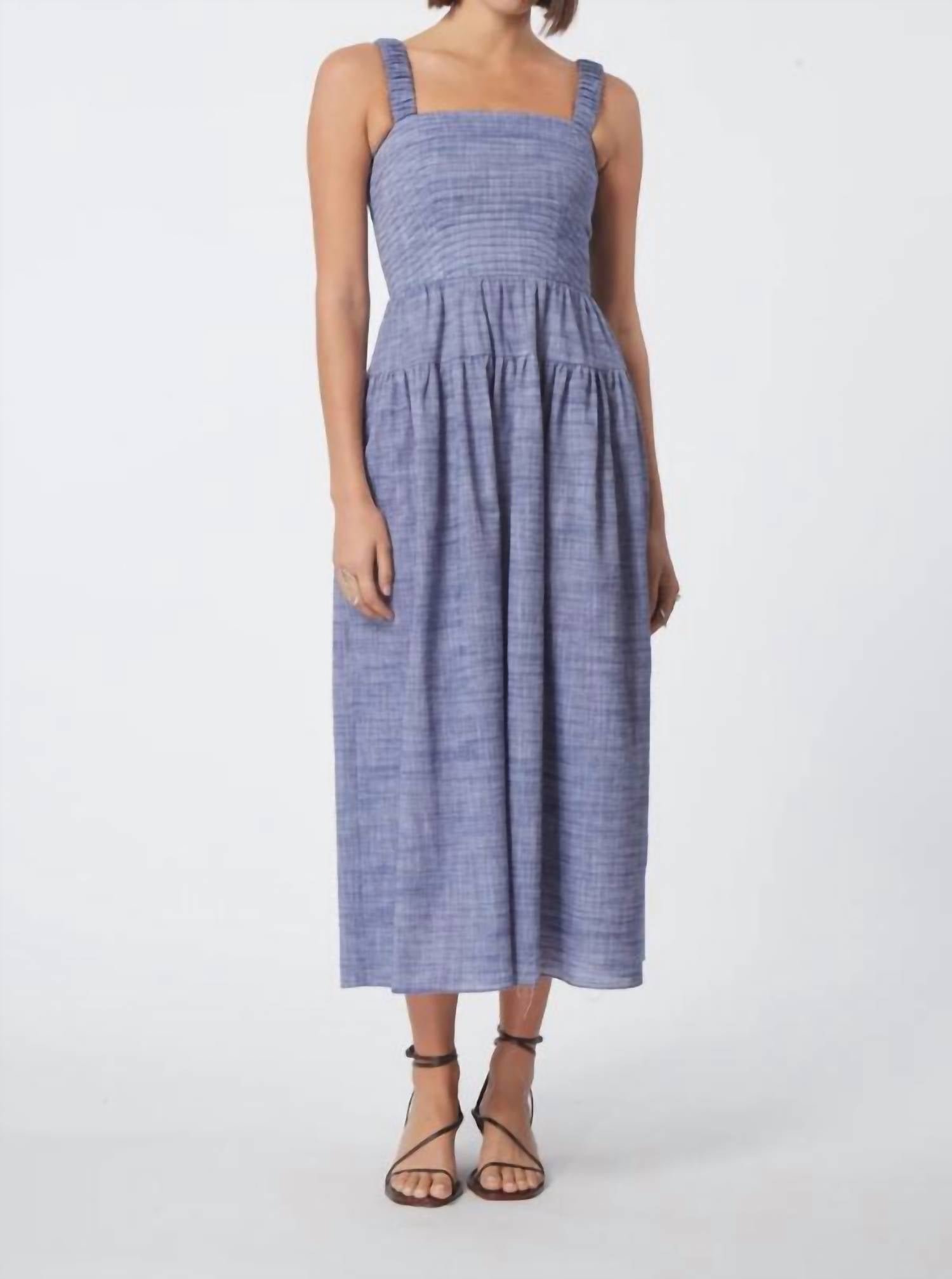 The perfect length dress does exist. This Midi Dress, crafted from 100% cotton chambray, features a square neckline, stitched quilted bust detail, and flowy A-line skirt with a smocked back for a comfortable fit. Complete with pockets and a zip closure, it offers effortless style and versatility.​