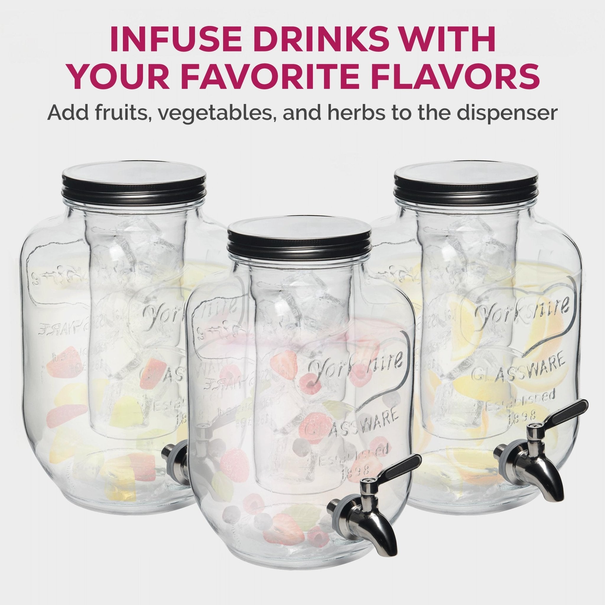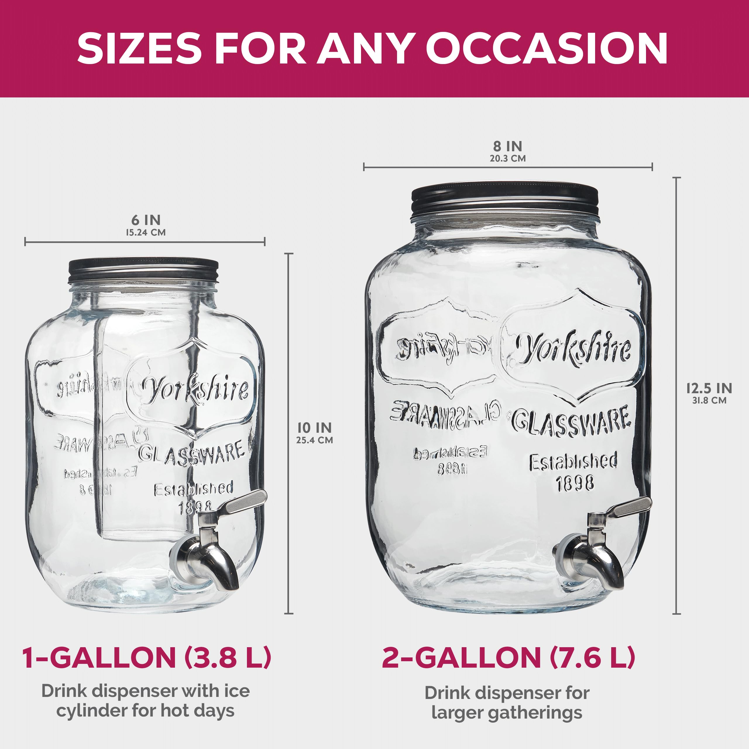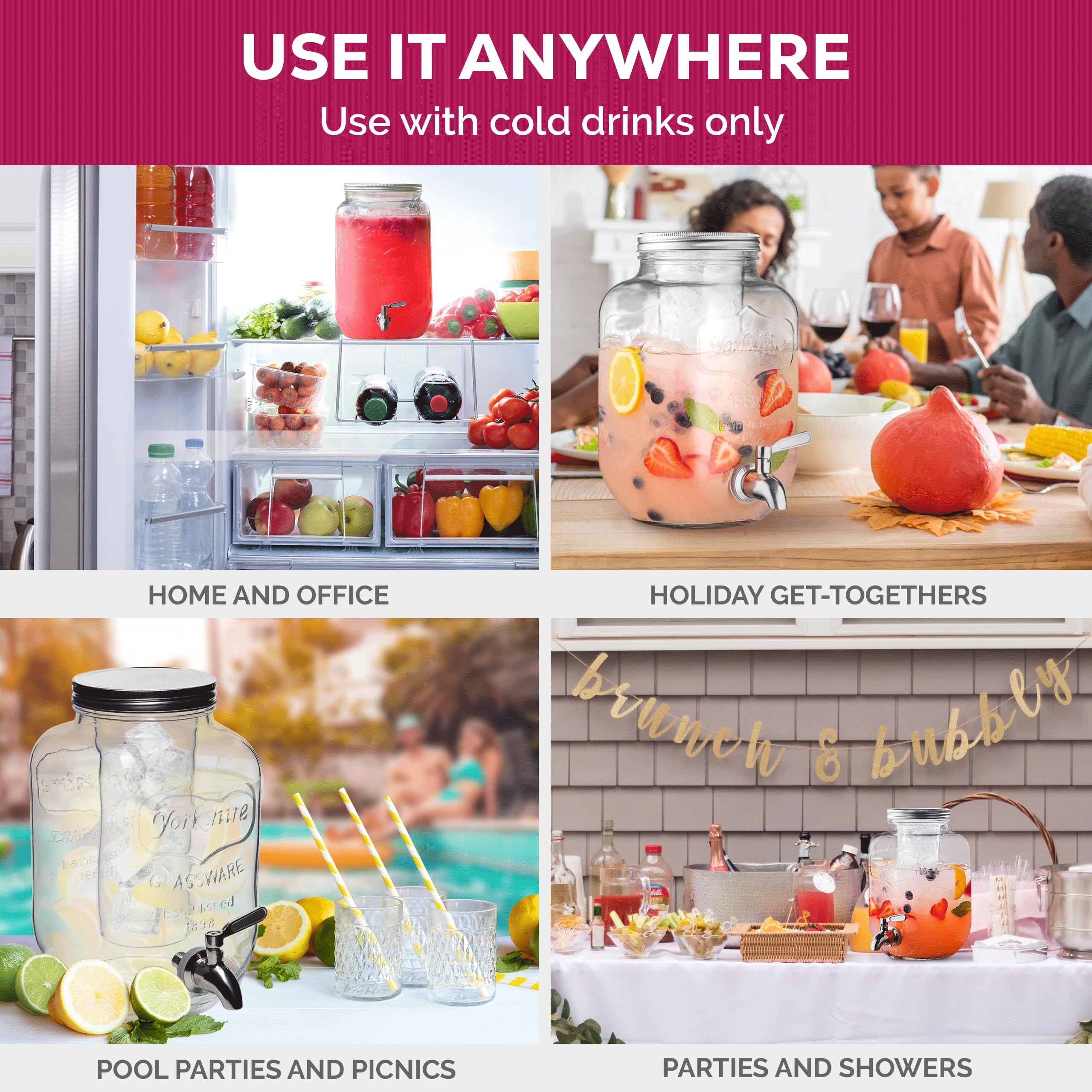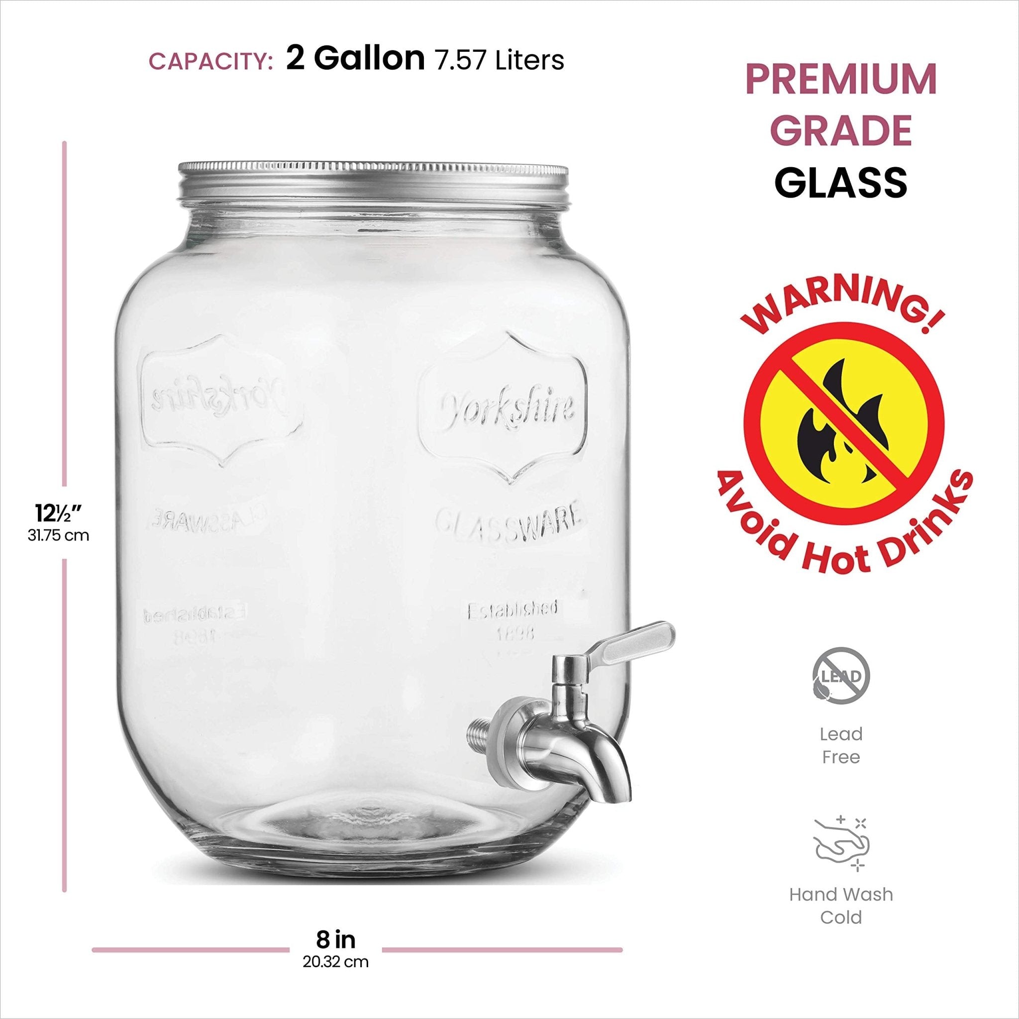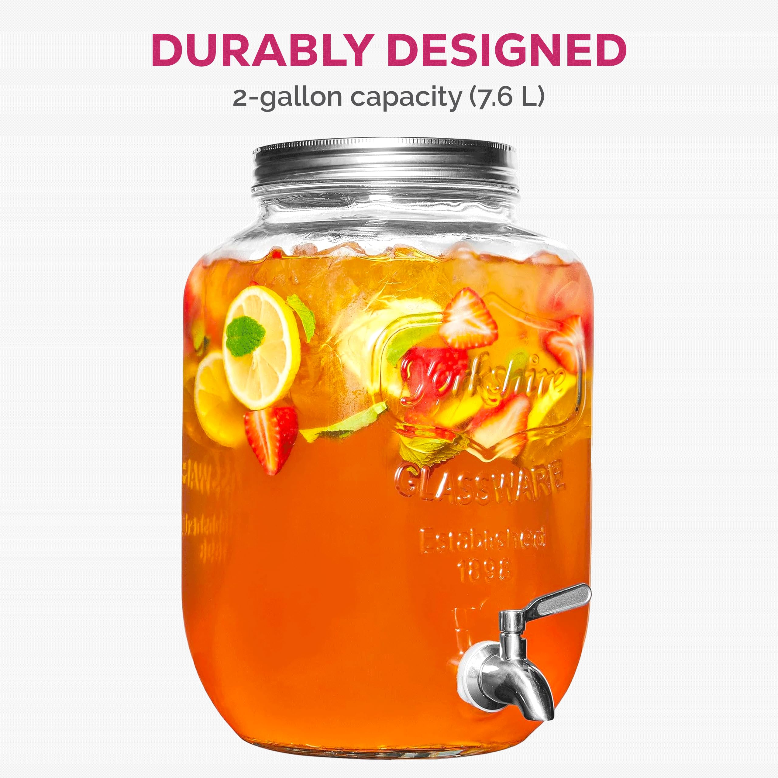 - STAINLESS STEEL LID - The glass water dispenser has a tin lid that keeps bugs or debris out of your beverages. For fresh lemonade, iced tea, infused water, punch, juices, and sangria.