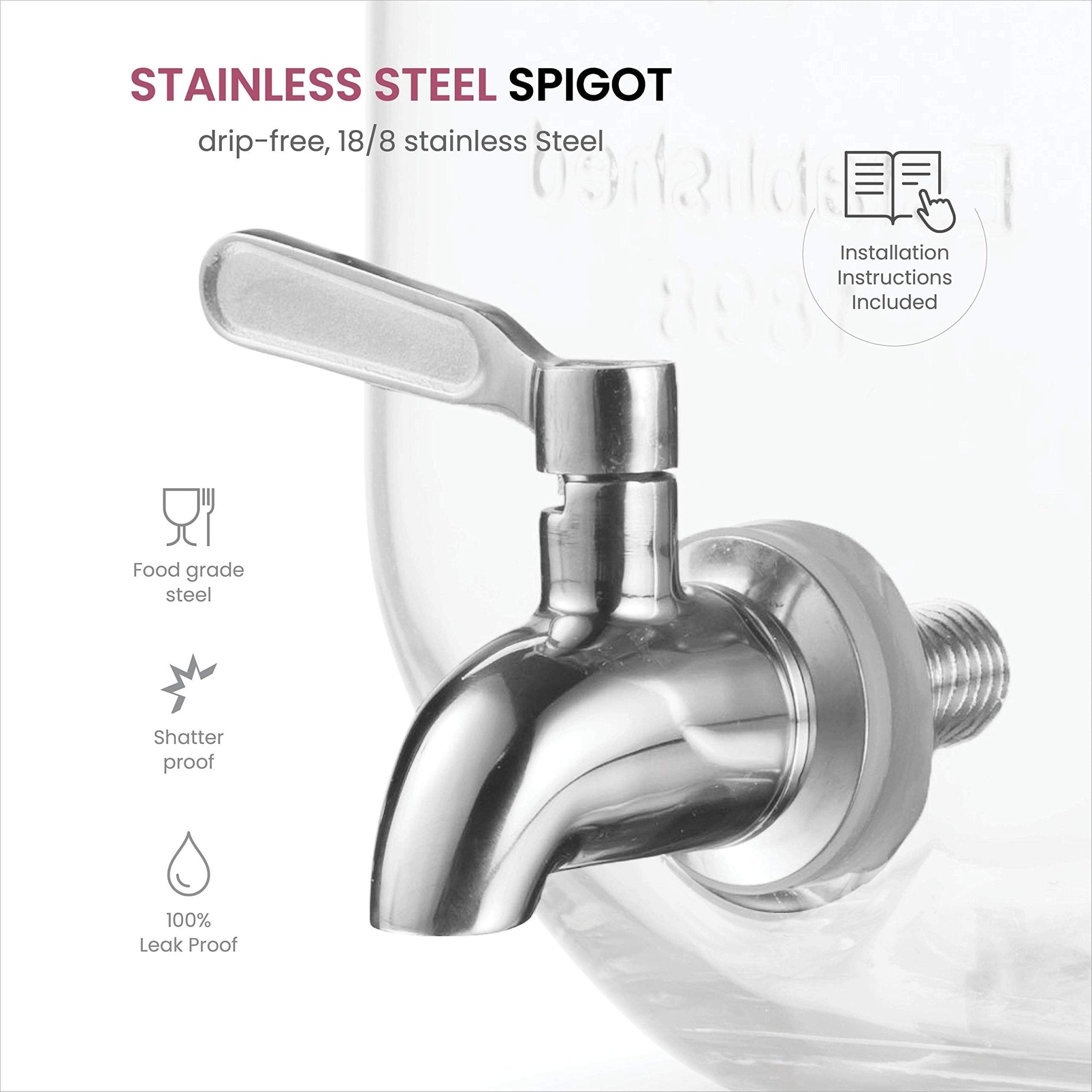 - STAINLESS STEEL MESS-FREE SPIGOT - An 18/8-stainless spigot is affixed to these drink dispensers for parties. The spout is 100% leak-proof and drip-free while allowing for strong steady flow.