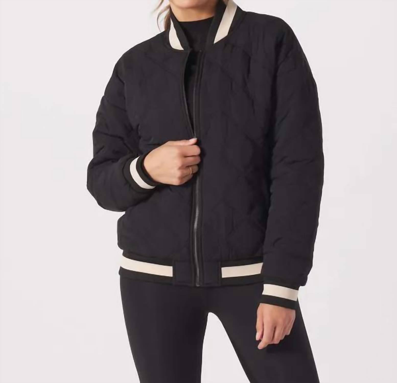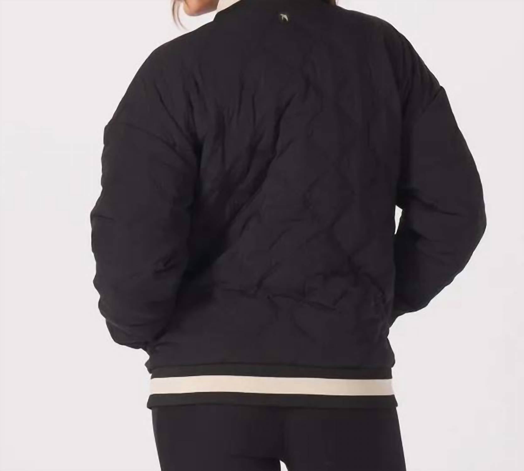 A clean and sophisticated version of the classic letterman. Contrast cuffs on the neckline, sleeves, and bottom of the jacket are reminiscent of the collegiate look, while the  oversized fit and inner pockets make it a great outer layer to throw over your outfit in gym, after class, or on the go.