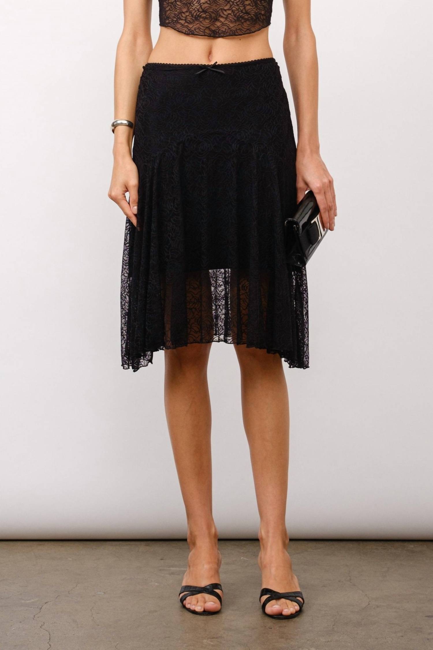 Tuck your favorite tee into this midi length skirt for an effortlessly cool look. Introducing the Bethel Lace Flared Midi Skirt by GOLDEN, a chic addition to any wardrobe for an elegant flair. This black midi skirt features a sheer lace design with a mini-length inner lining, offering a touch of sophistication. Crafted from high-quality polyester, it ensures comfort while making a style statement. Closure: Pull on. Care: Machine wash, line dry. Perfect for New Year's Eve or a cocktail party, embrace the Y2K trend this spring with this timeless piece.