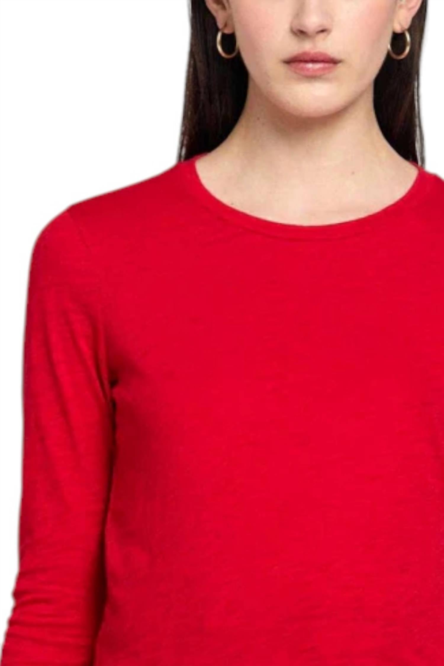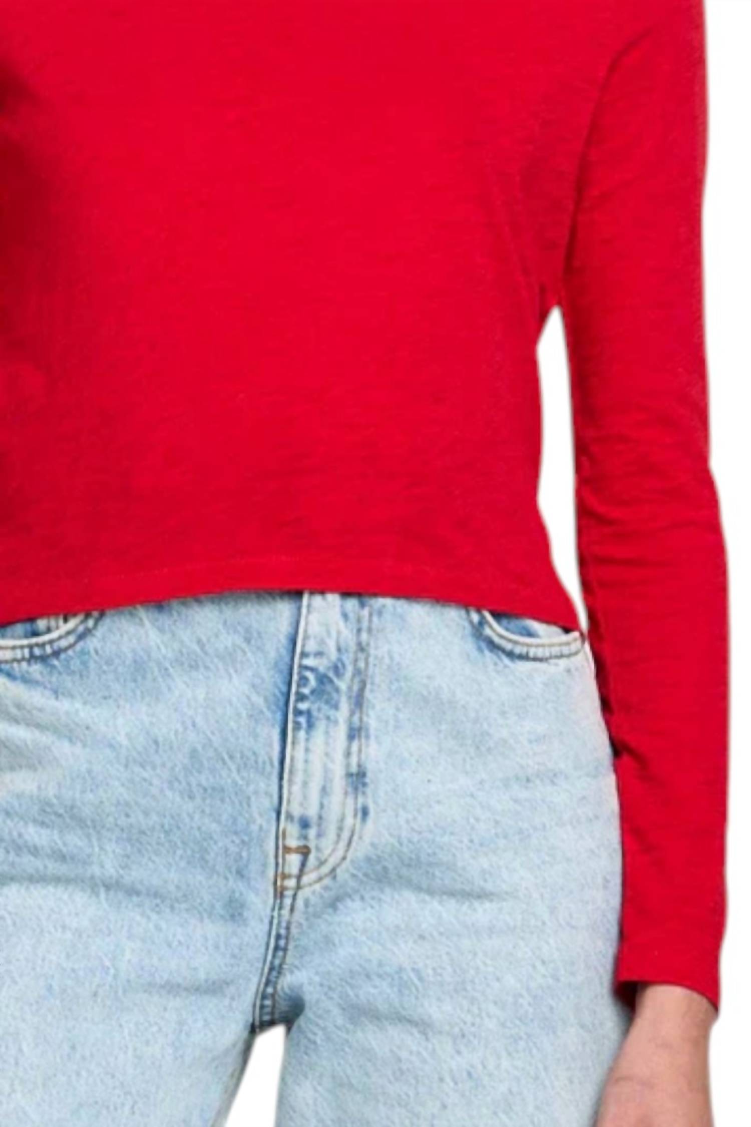 The perfect long sleeve tee that goes with just about anything. Discover the Long Sleeve Cropped Boy Crew Tee by GOLDIE in vibrant Barbados Cherry, designed to elevate your style with its boyish charm. This solid red tee is crafted from 100% Peruvian pima cotton, offering a luxurious feel and a crewneck fit. Featuring a boxy cut with side slits, it pairs perfectly with your favorite high-waisted jeans and skirts. Closure: Pull on. Care: Machine washable.