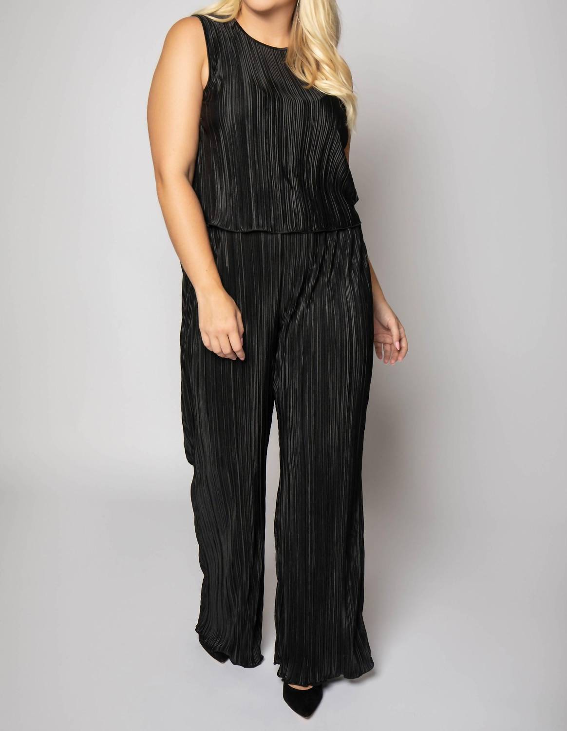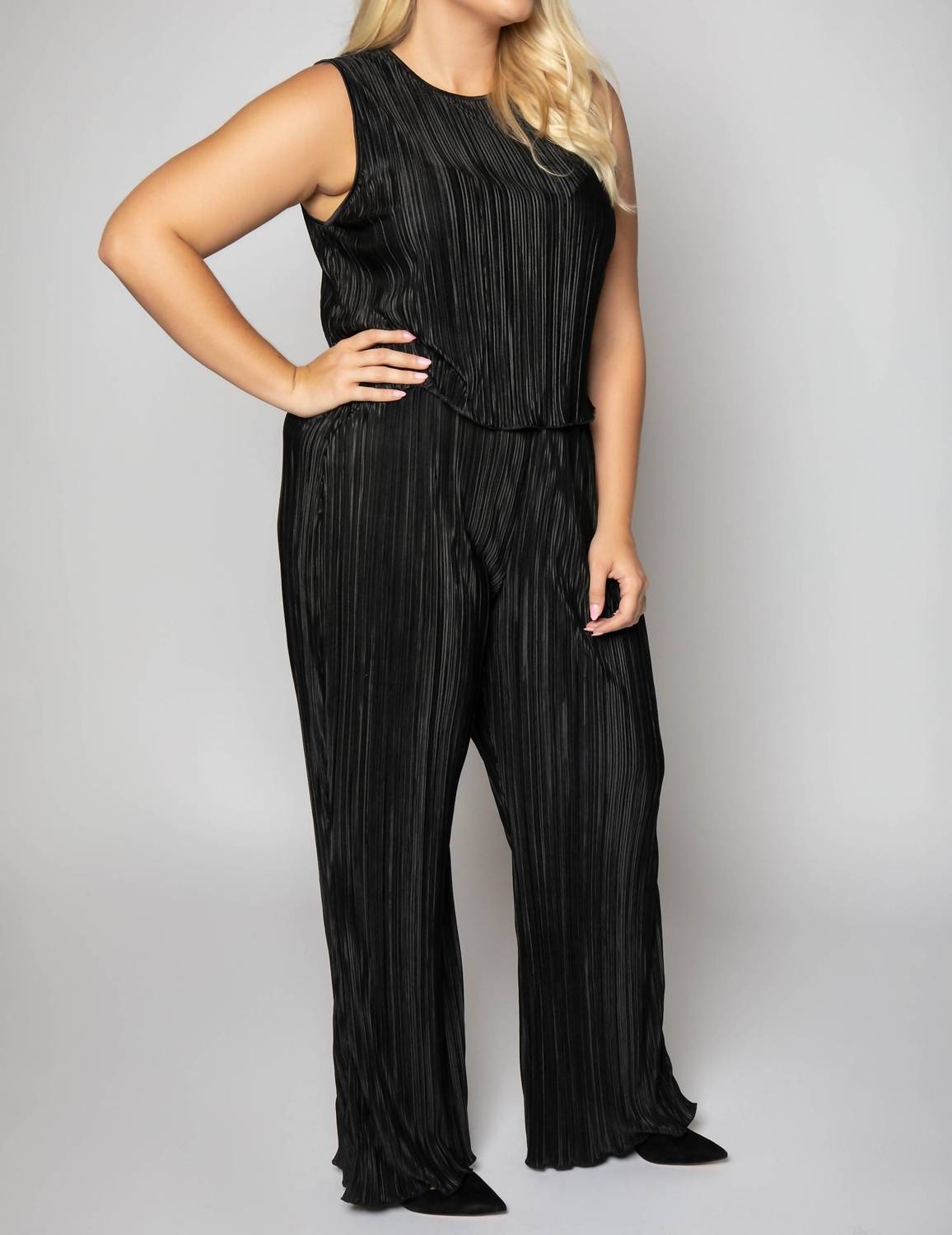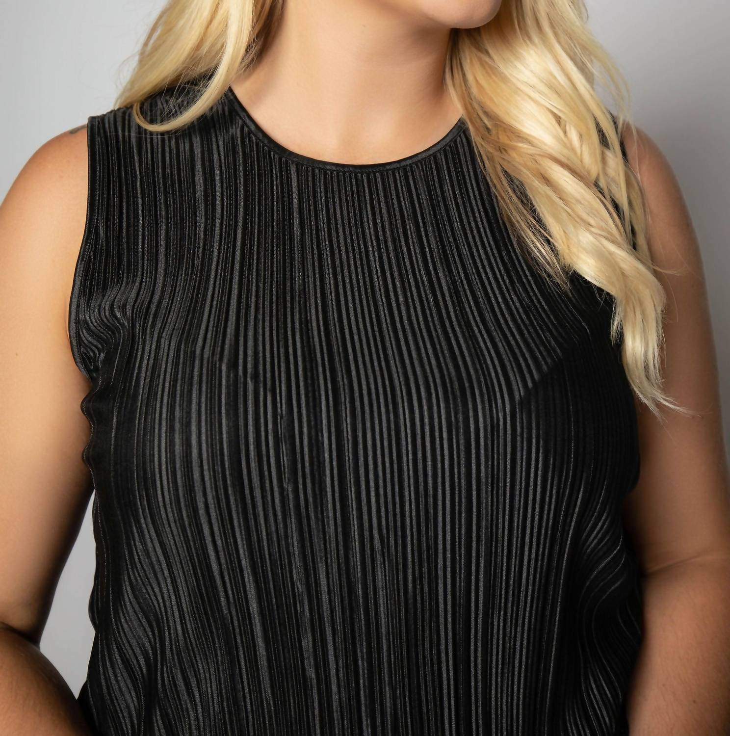 The perfect tank top for those warmer weather seasons. Elevate your wardrobe with the Always Fits Plissé Shell Tank by GOOD AMERICAN, a stunning blend of texture and shine. This sleeveless black tank crafted from 100% polyester features a textured pleat fabric for a luxurious look. With a cropped silhouette that drapes elegantly, it has a back button closure for a refined finish. Designed for the perfect dinner party outfit, care for this piece with dry cleaning only. Ideal for the fall season in a plus size fit, this top embodies the quiet luxury trend.