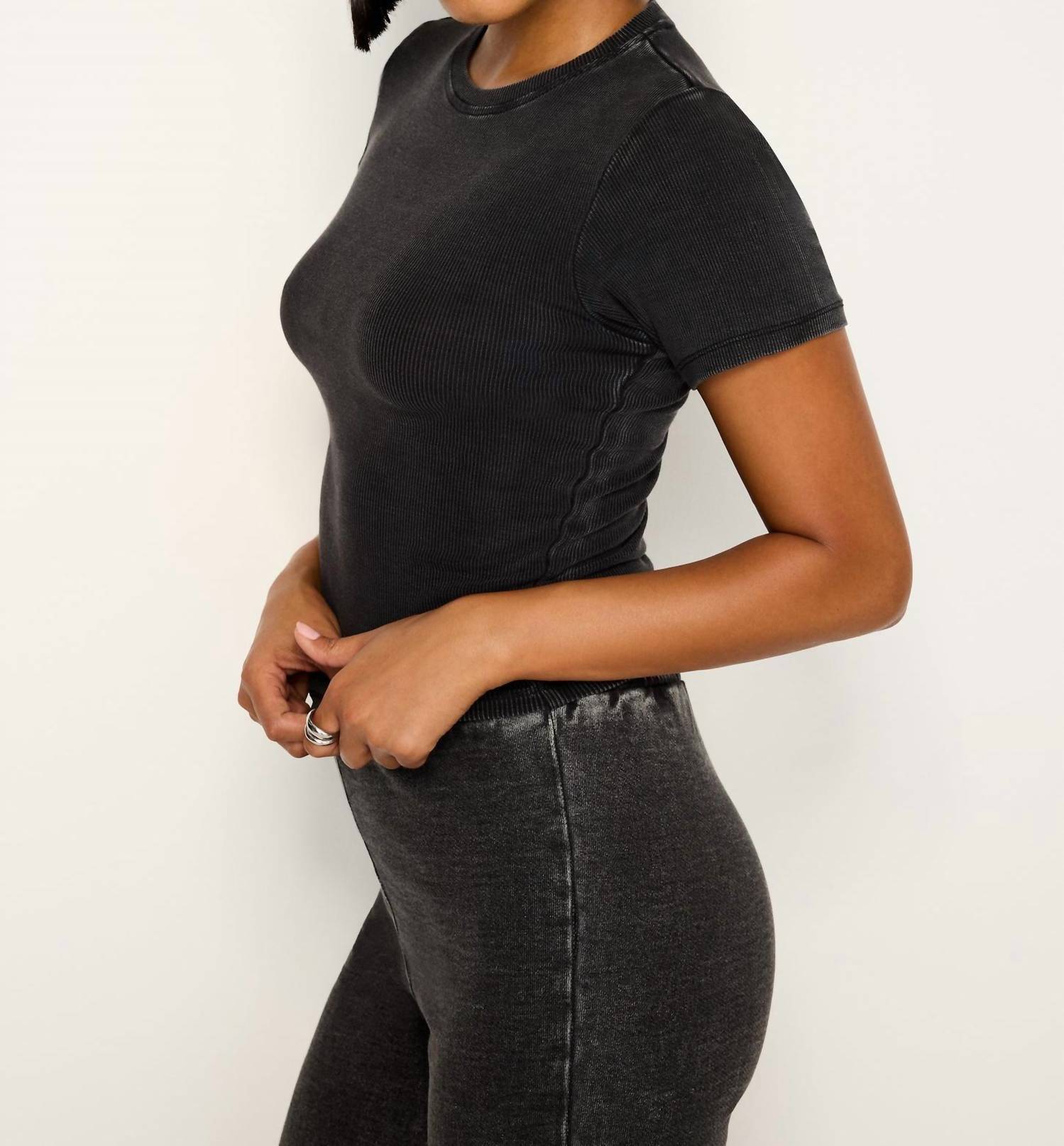 The short sleeve tee you'll want in every color. The Jeanius Fitted Tee by GOOD AMERICAN is your go-to black everyday essential crafted for women with short sleeves and a flattering crew neckline. Made from a super soft, slinky micro rib fabric that has the unique look of denim, this tee ensures comfort while maintaining its shape. With a pull-on closure, it's easy to wear with your favorite jeans or trousers. Care instructions: Machine wash.