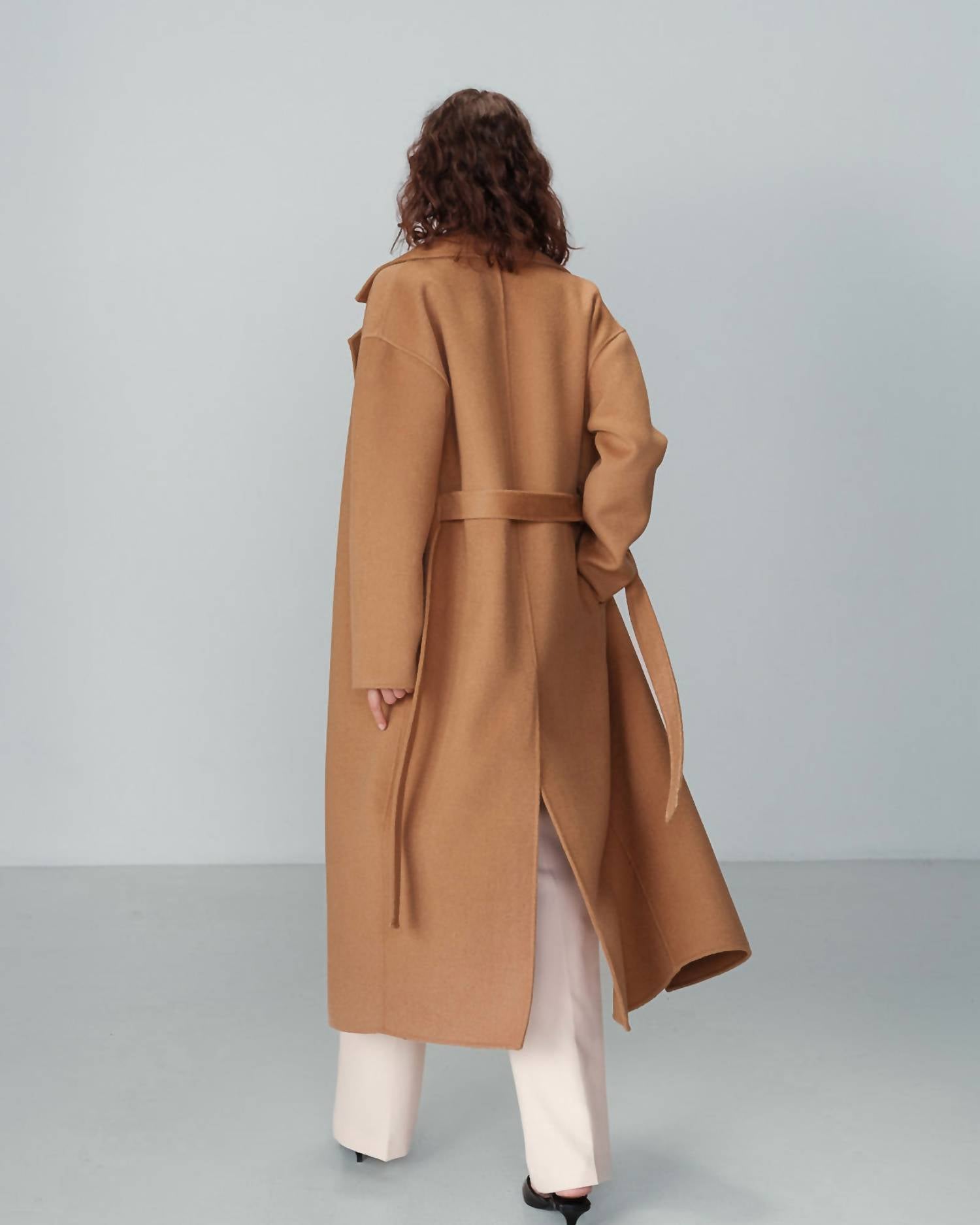 An elevated version of your favorite classic blazer. Wrap yourself in elegance with the Noemie Tie Overcoat by Grace & Mila, a stunning camel piece crafted from a premium wool blend. This long coat features low armholes and long sleeves, complemented by a tailored collar and belt loops with ties for an adjustable fit. Designed as part of the 'Un Brin de Verts' natural fibres range, it boasts a shoulder length of 120 cm for size S. Composition: 70% Wool, 30% Polyester.