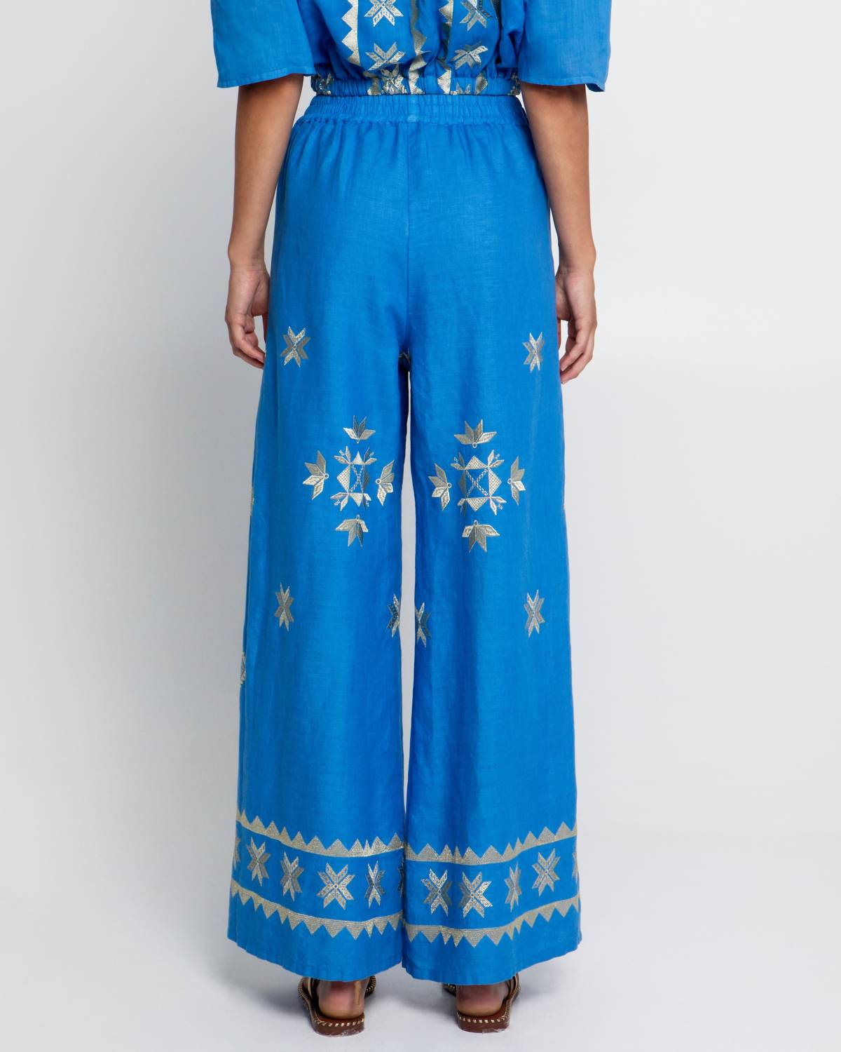 Experience the relaxed elegance of the Lefkada Elastic Waist Pants by Greek Archaic Kori, crafted from 100% linen in a chic blue hue. These wide-leg, high-rise pants boast intricate gold embroidery stitching, offering a perfect boho chic vibe for your summer vacation wardrobe. With a comfortable pull on closure and a relaxed fit, they provide both style and comfort. Made in Greece, these patterned trousers require hand washing and should be laid flat to dry, ensuring their longevity.