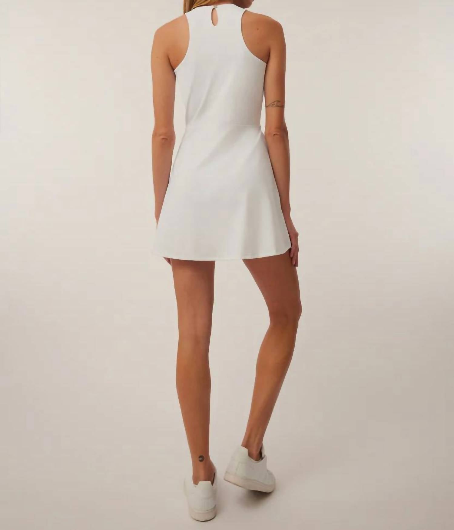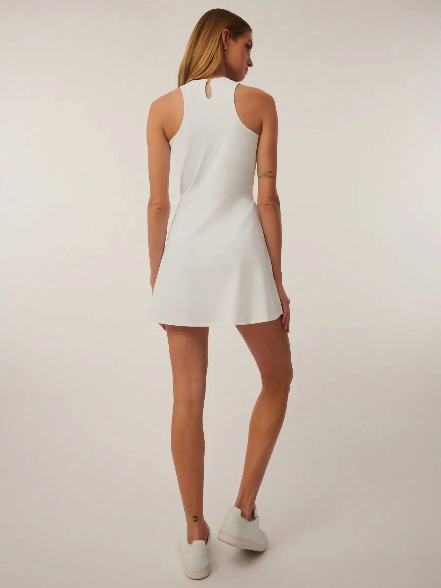 A short and breezy dress for those warmer days. Experience the sleek elegance of the Performance Twist-neck Mini Dress by Greyson Clothiers, crafted for the modern woman. This sleeveless dress in Arctic White boasts a luxurious Italian fabric, providing a slim, form-fitting silhouette perfect for athleisure and game day occasions. Featuring a high twist halter neckline, it includes a practical pull-on closure and a moisture-wicking built-in shortie for added comfort. Care for this solid A-line piece is simple, with machine wash and tumble dry instructions.